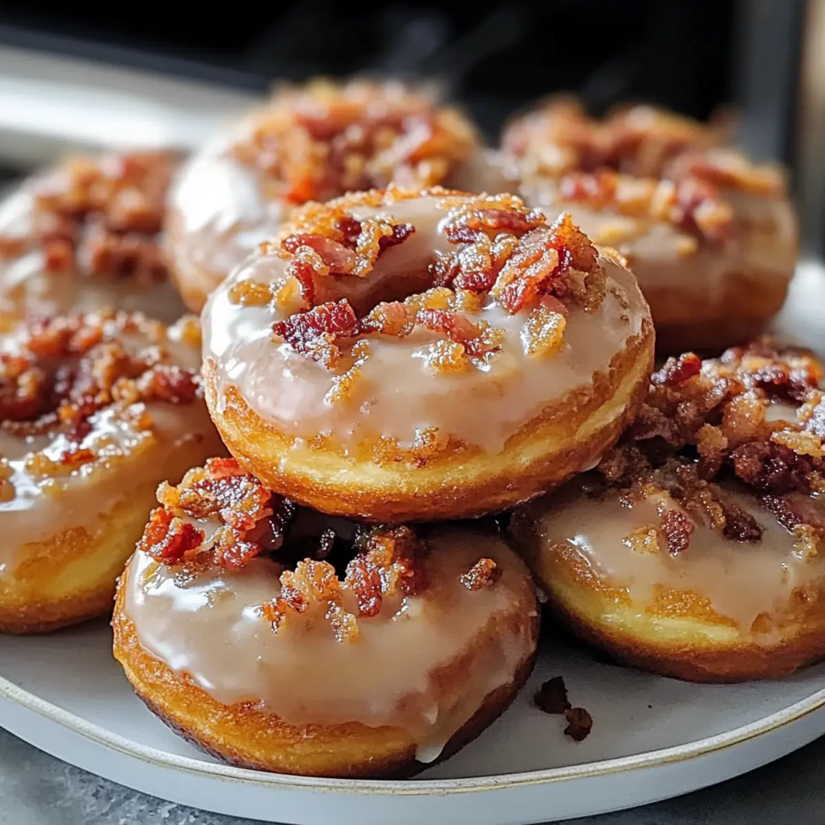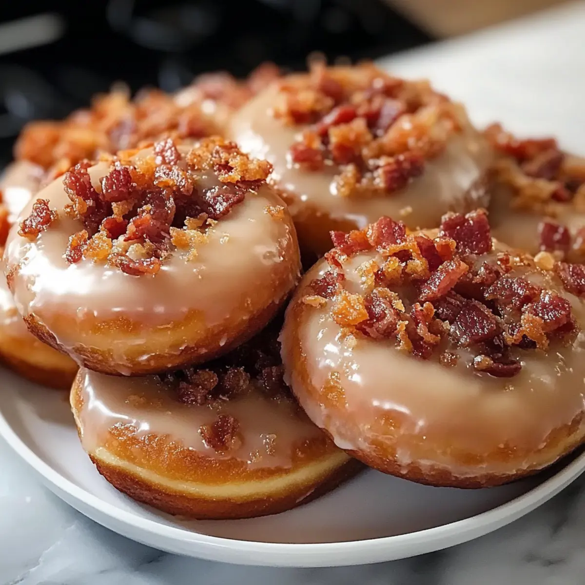 - Tauche die warmen Donuts in die Glasur und bestreue sie mit Bacon.