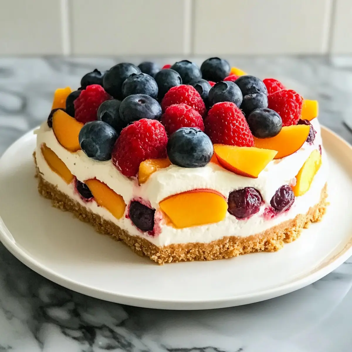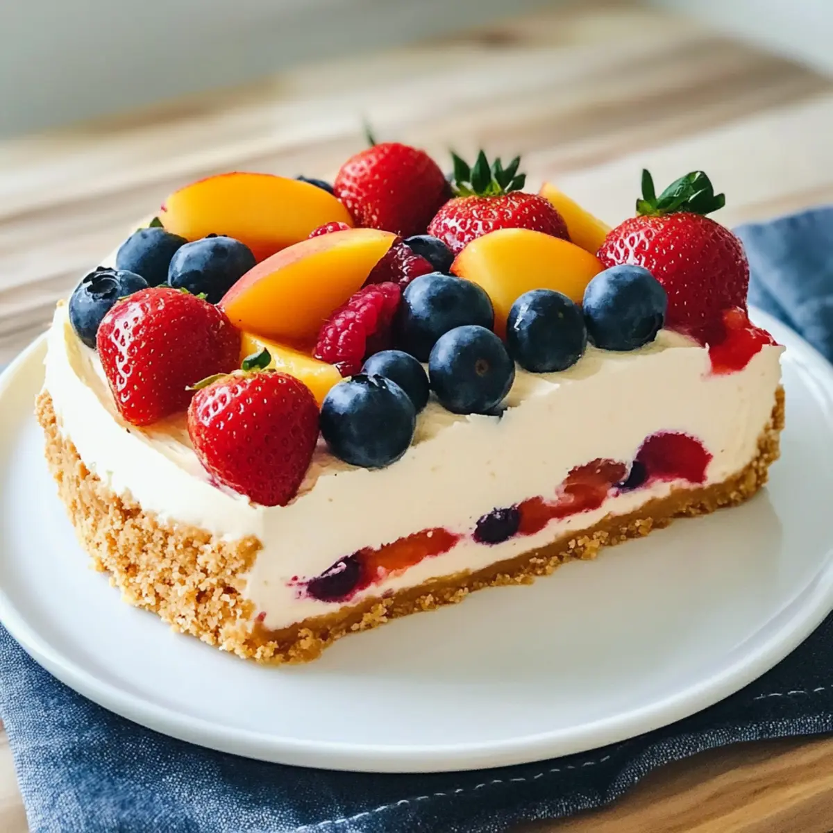 Erfrischende Aromen: Die Kombination aus süßen Pfirsichen und saftigen Beeren macht diesen Käsekuchen zu einem köstlichen Sommergenuss.
