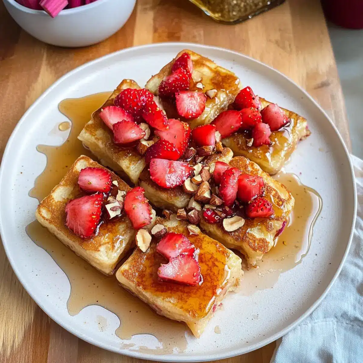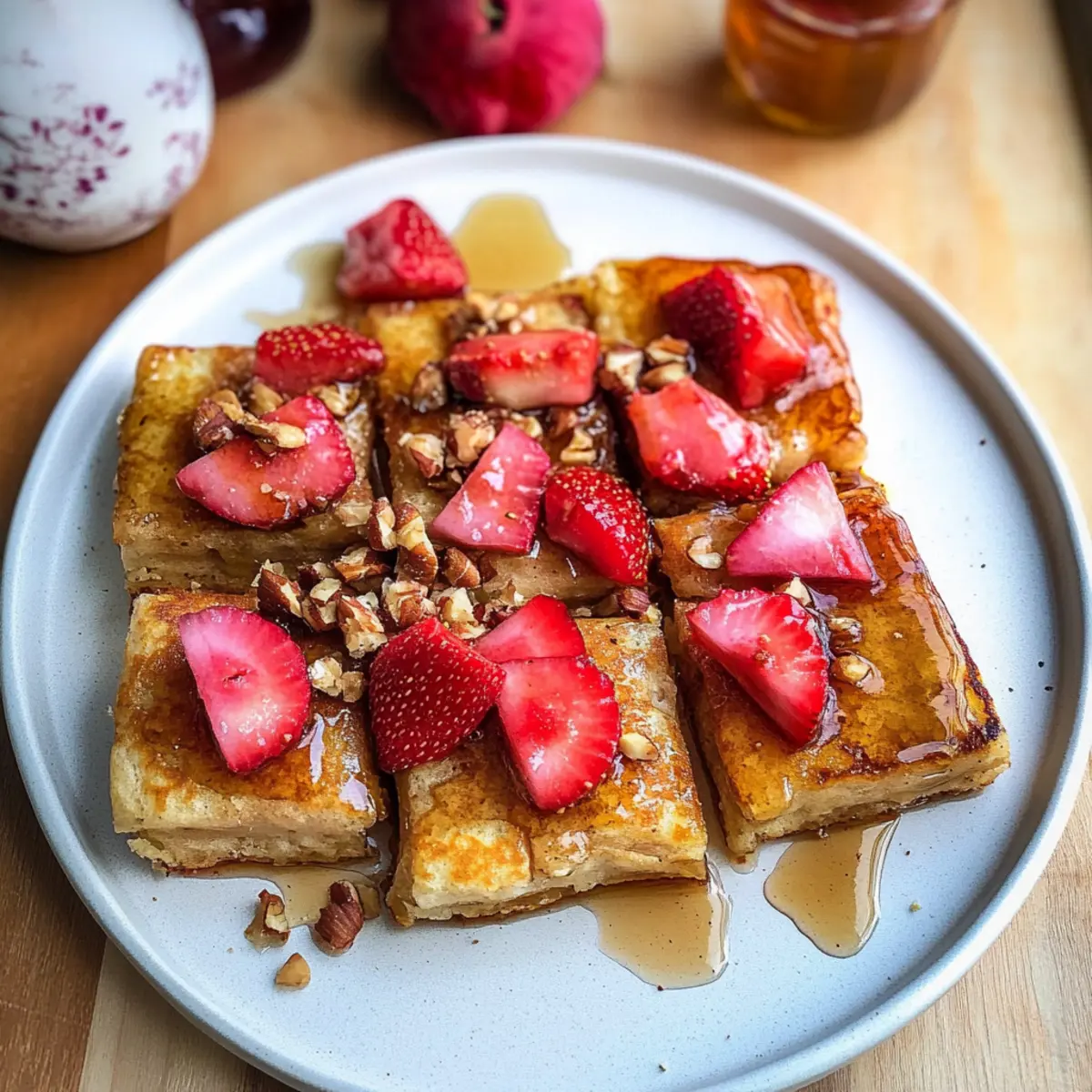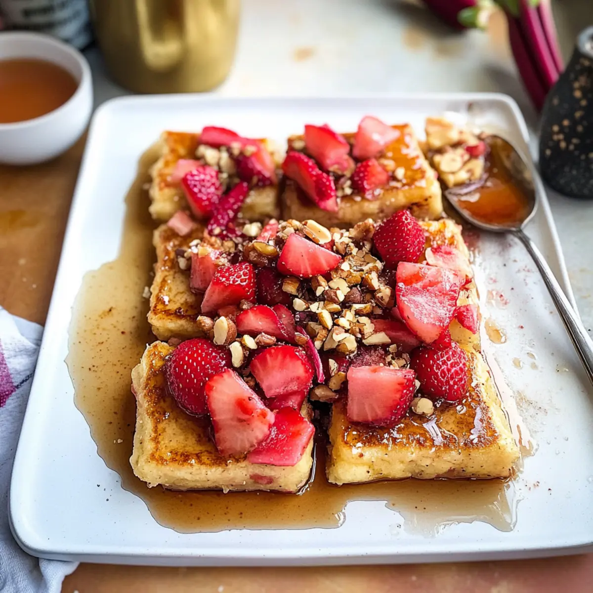 Geröstete Erdbeeren: Diese süßen, leicht karamellisierten Früchte bringen Frische und eine süße Note, die wunderbar mit dem fluffigen Teig harmoniert.