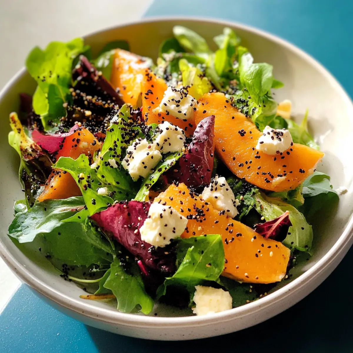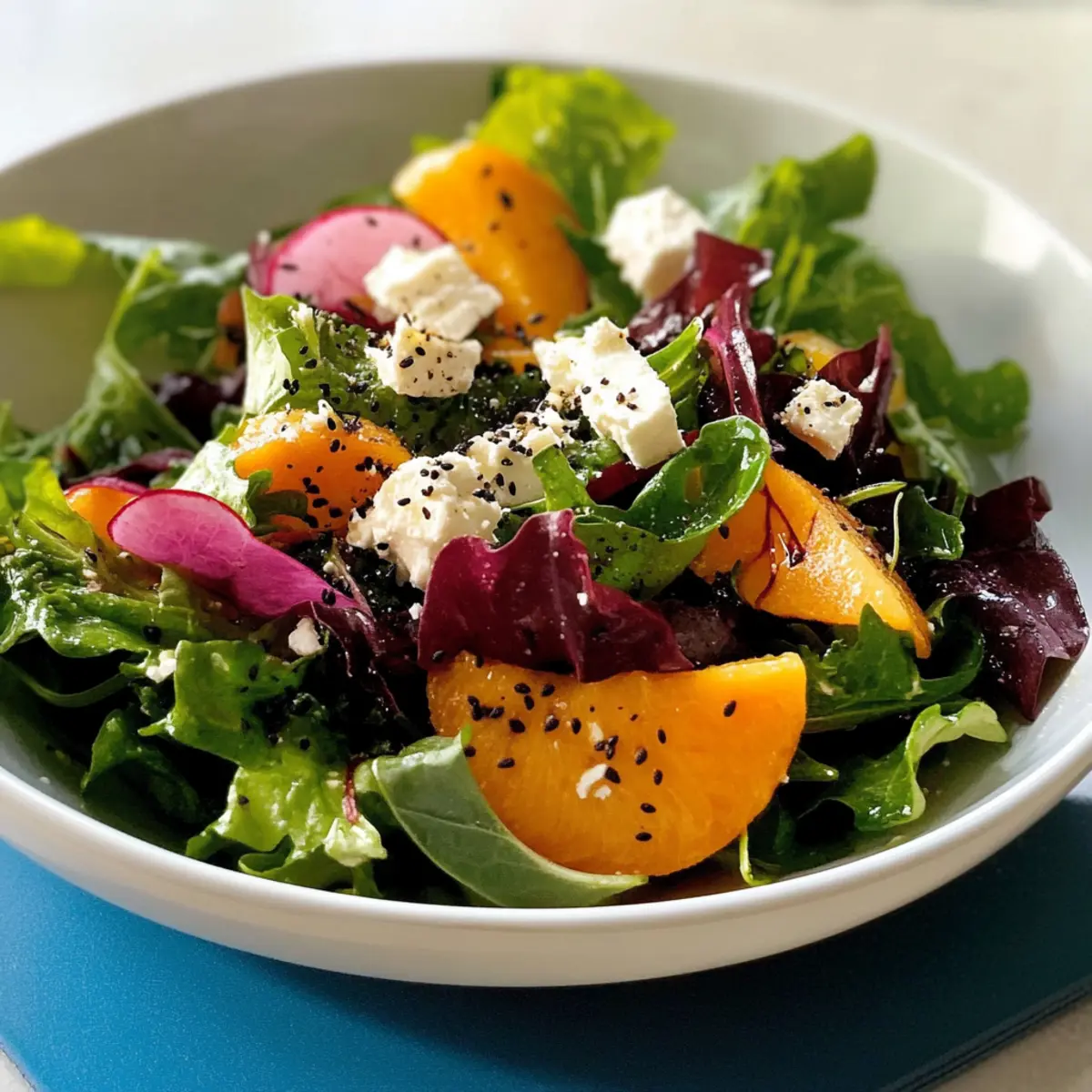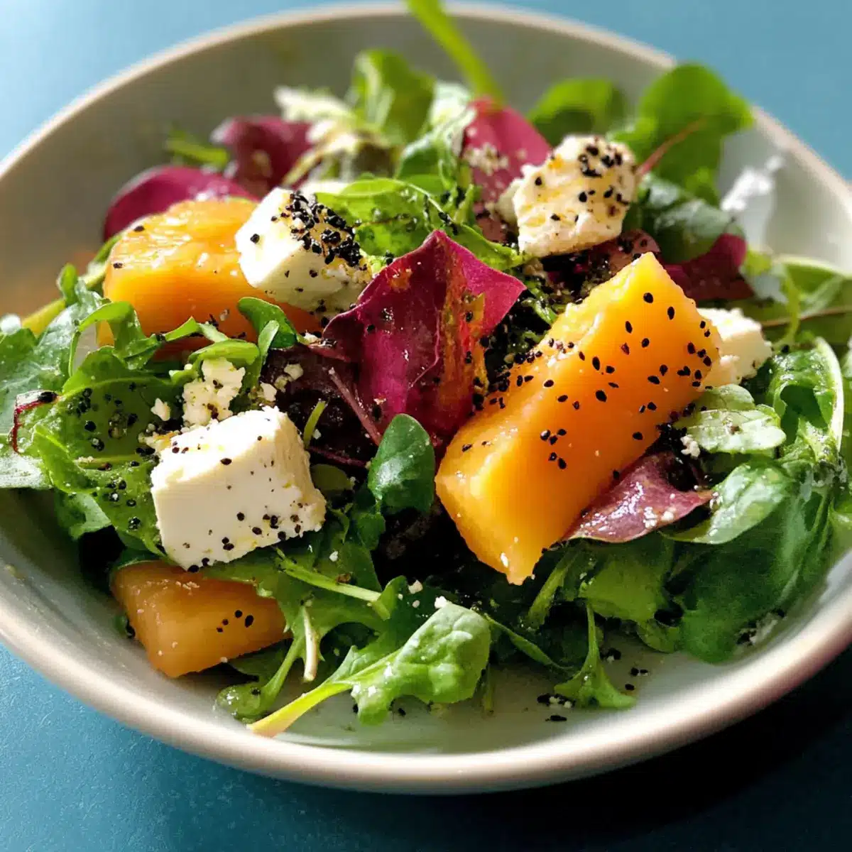 Nun die reife Papaya in dünne Scheiben schneiden und über den Salat legen. Frischen Limettensaft darüber träufeln, um eine spritzige Note hinzuzufügen. Fügen Sie nach Belieben zerbröckelten Feta-Käse, schwarze Kümmelsaat und einen großzügigen Schuss Waldhonig hinzu, um den Salat zu verfeinern.