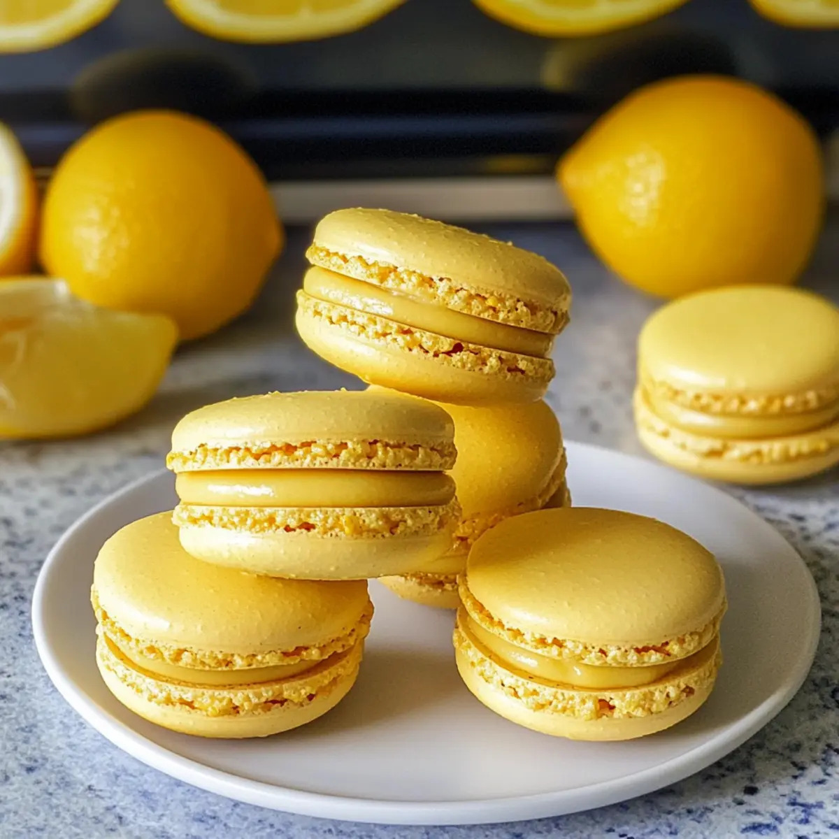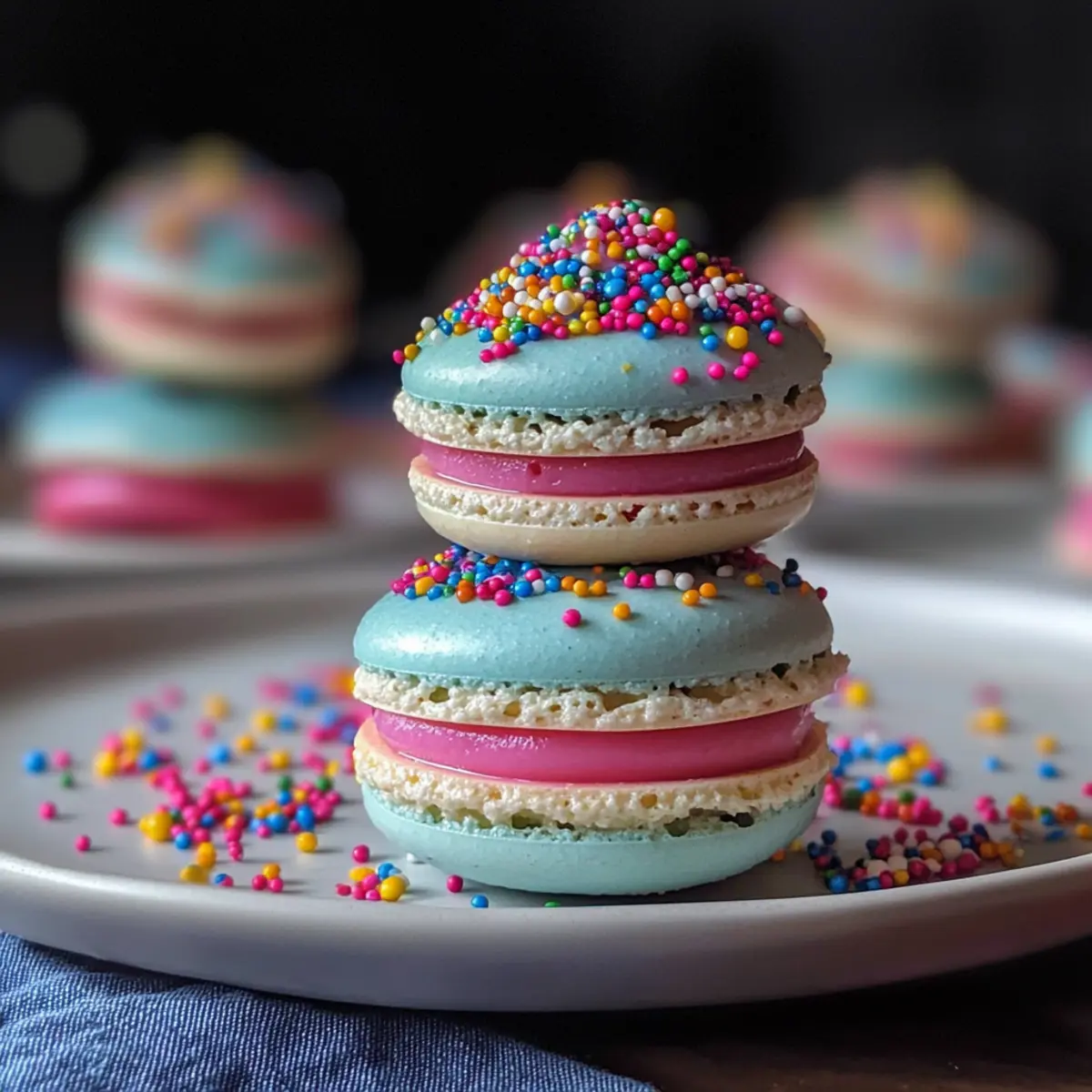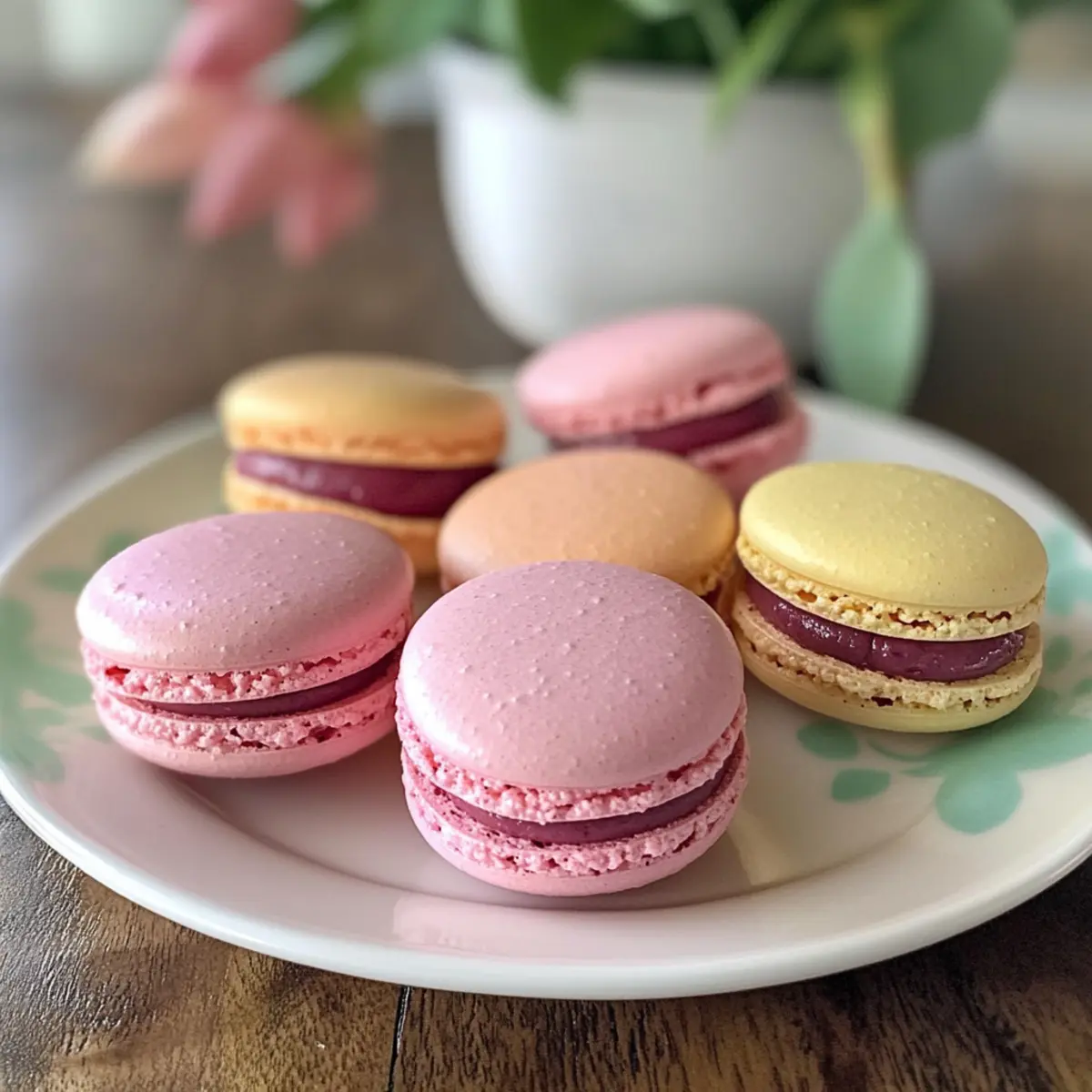 Bunte Macarons mit Himbeercurd und weißer Ganache