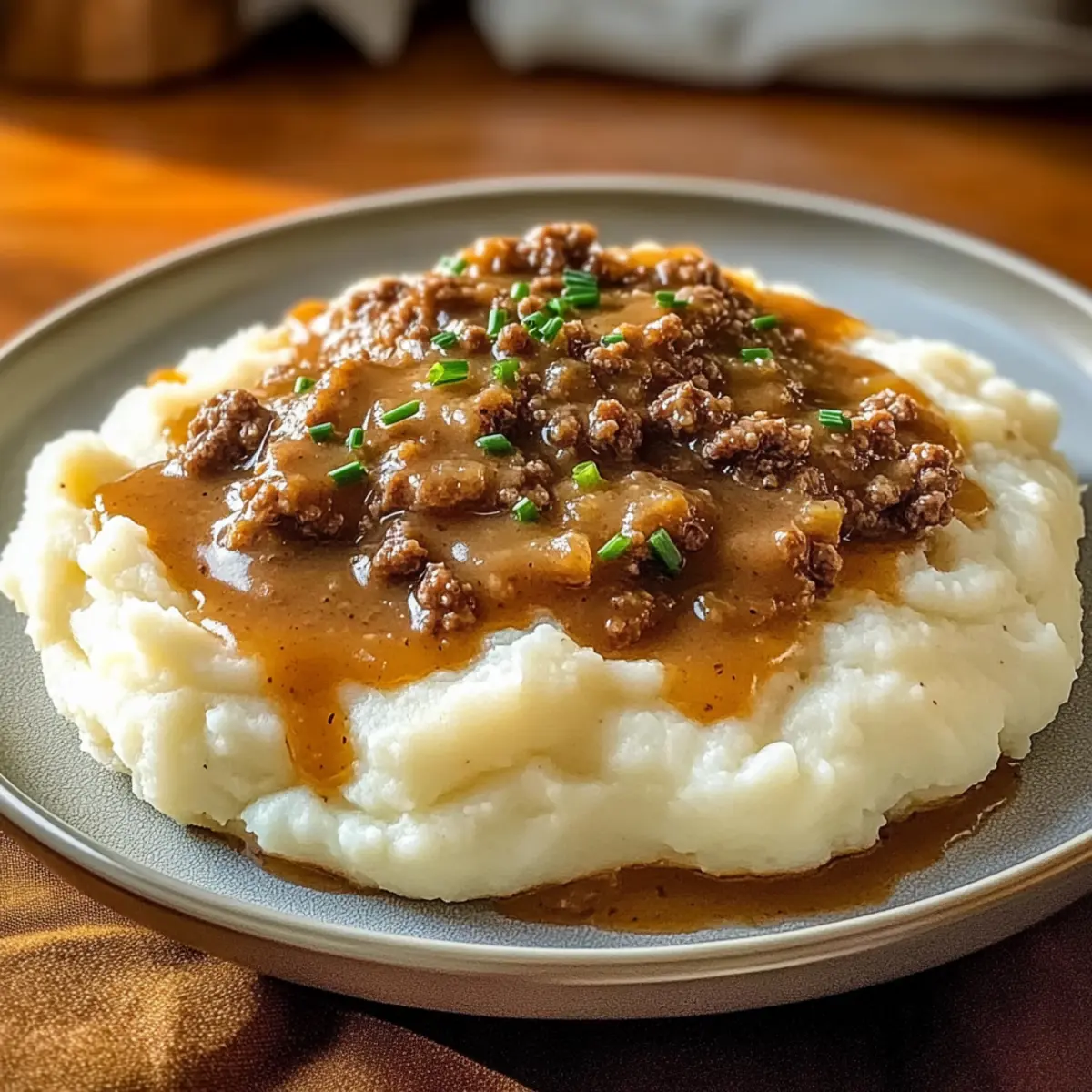 Herzhafter Hackfleisch mit Kartoffelpüree und Sauce genießen