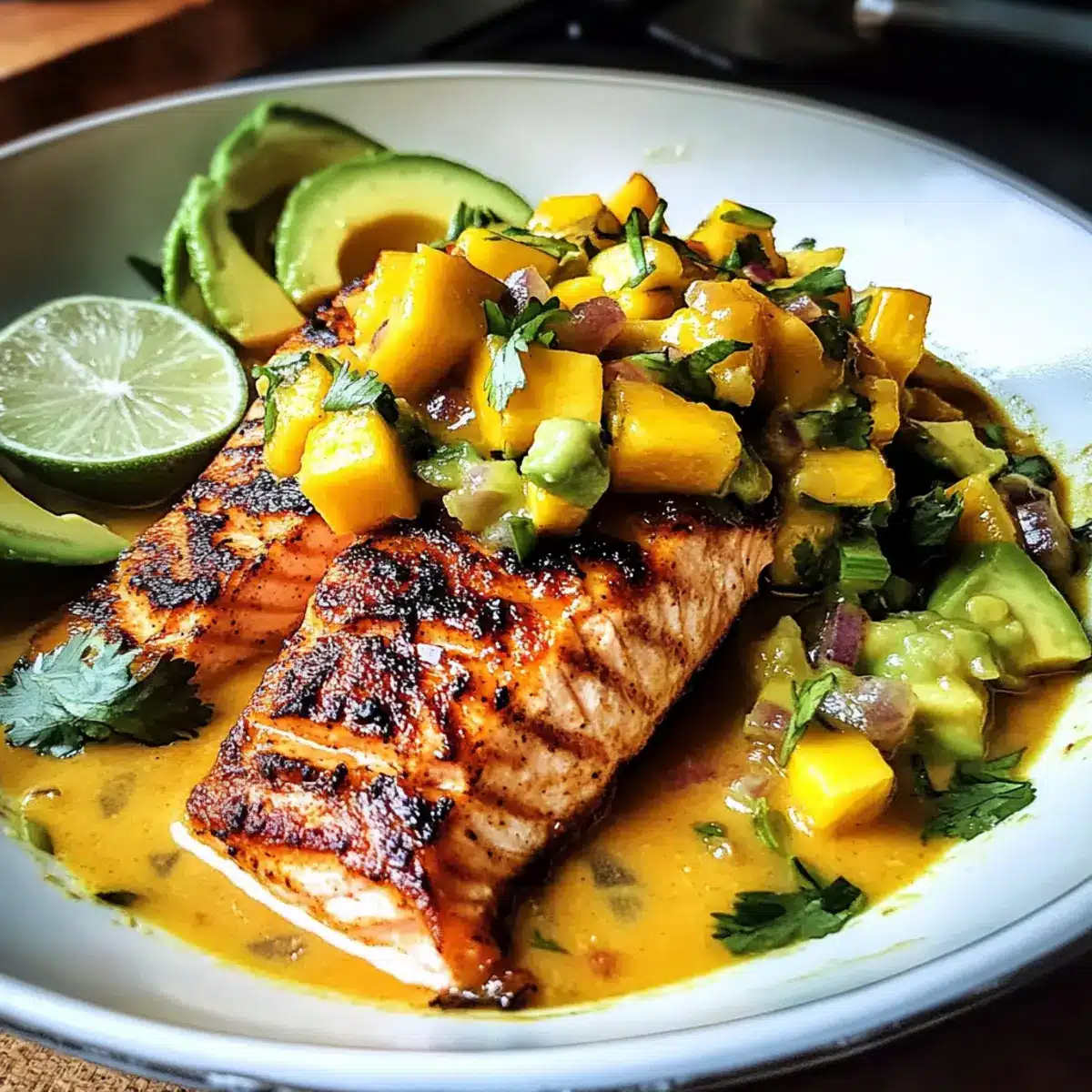 Leckeres BBQ Lachs Curry mit Mango Avocado Salsa