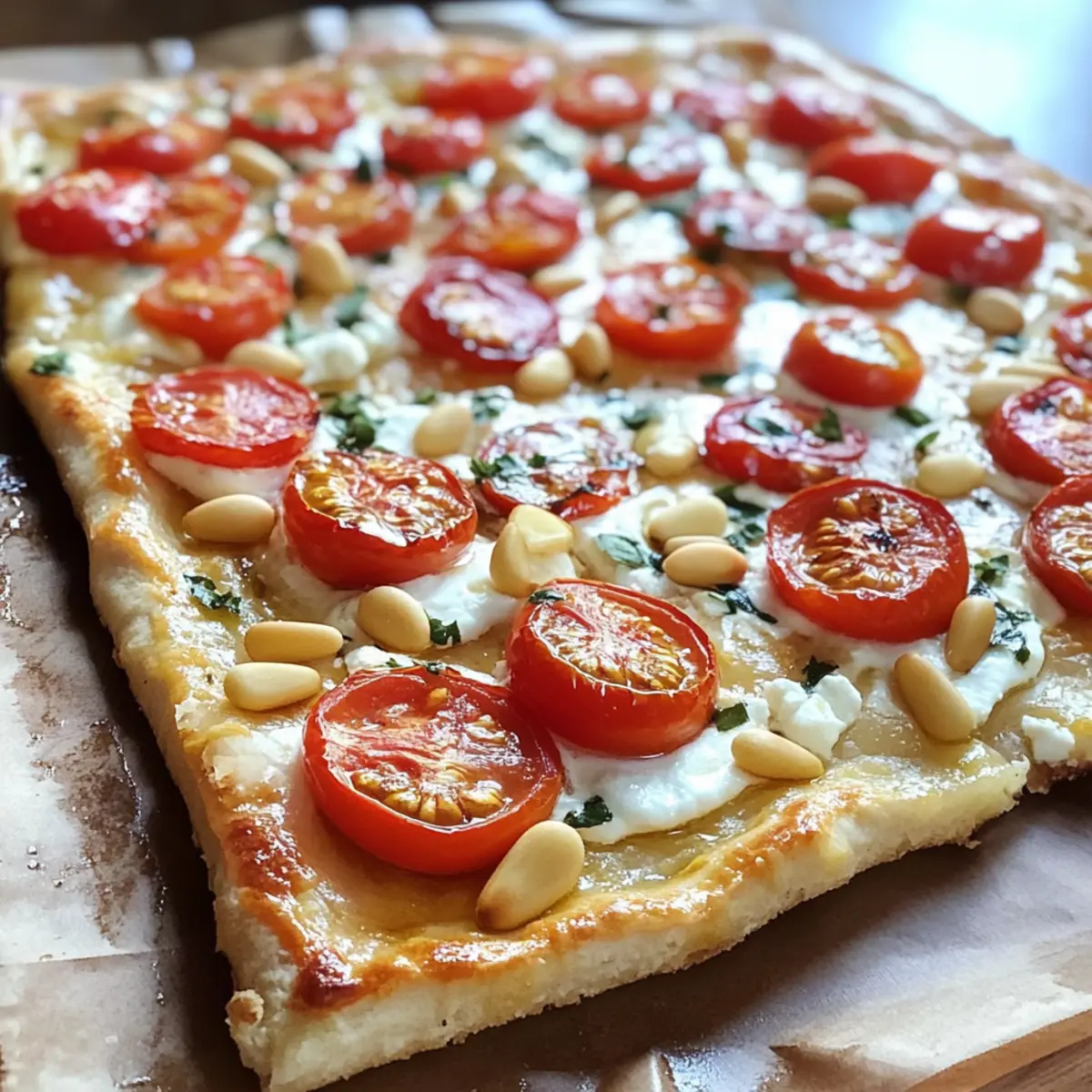Bunter Tomaten-Ziegenkäse-Flammkuchen mit Thymian
