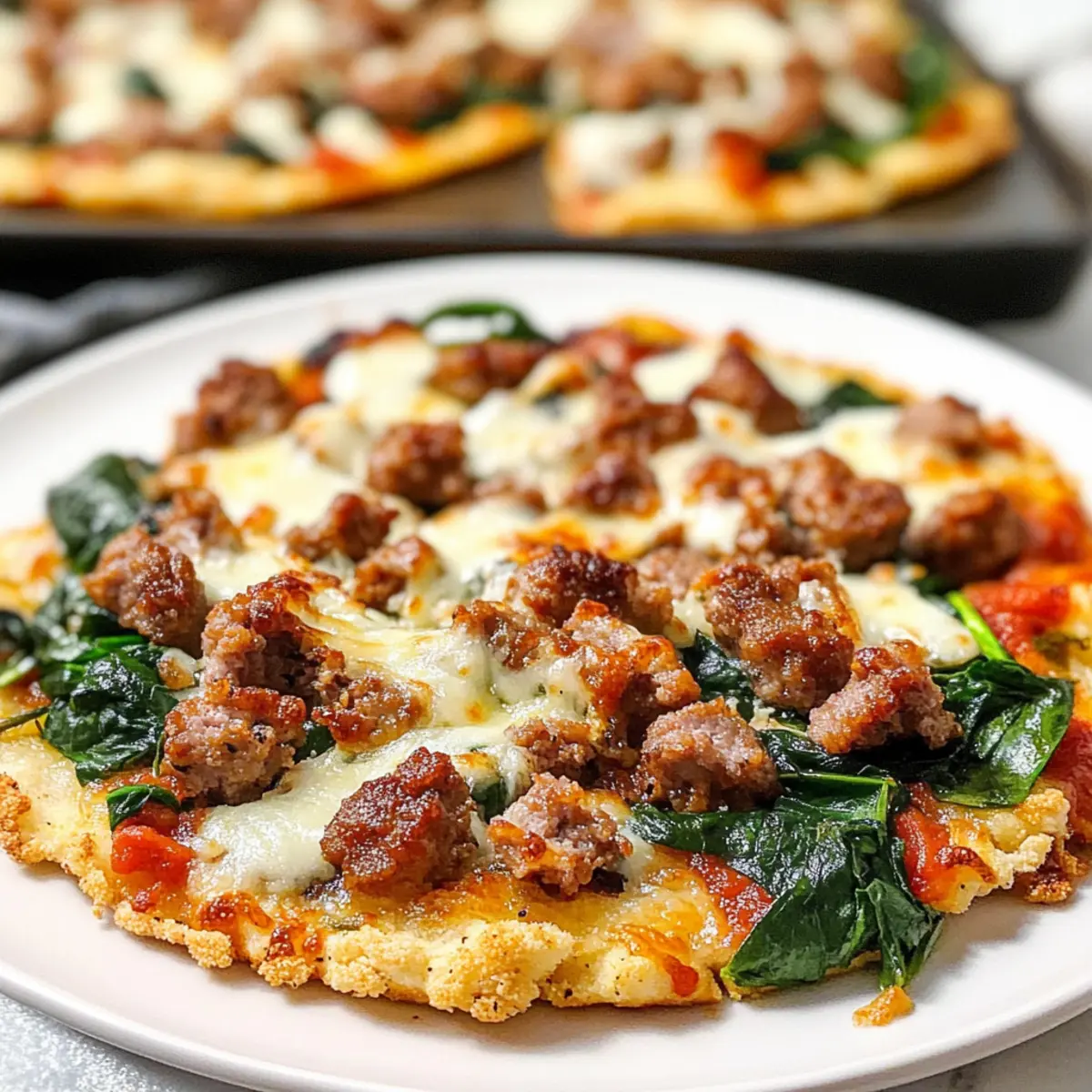 Keto Blumenkohlpizza mit Wurst und Spinat genussvoll genießen