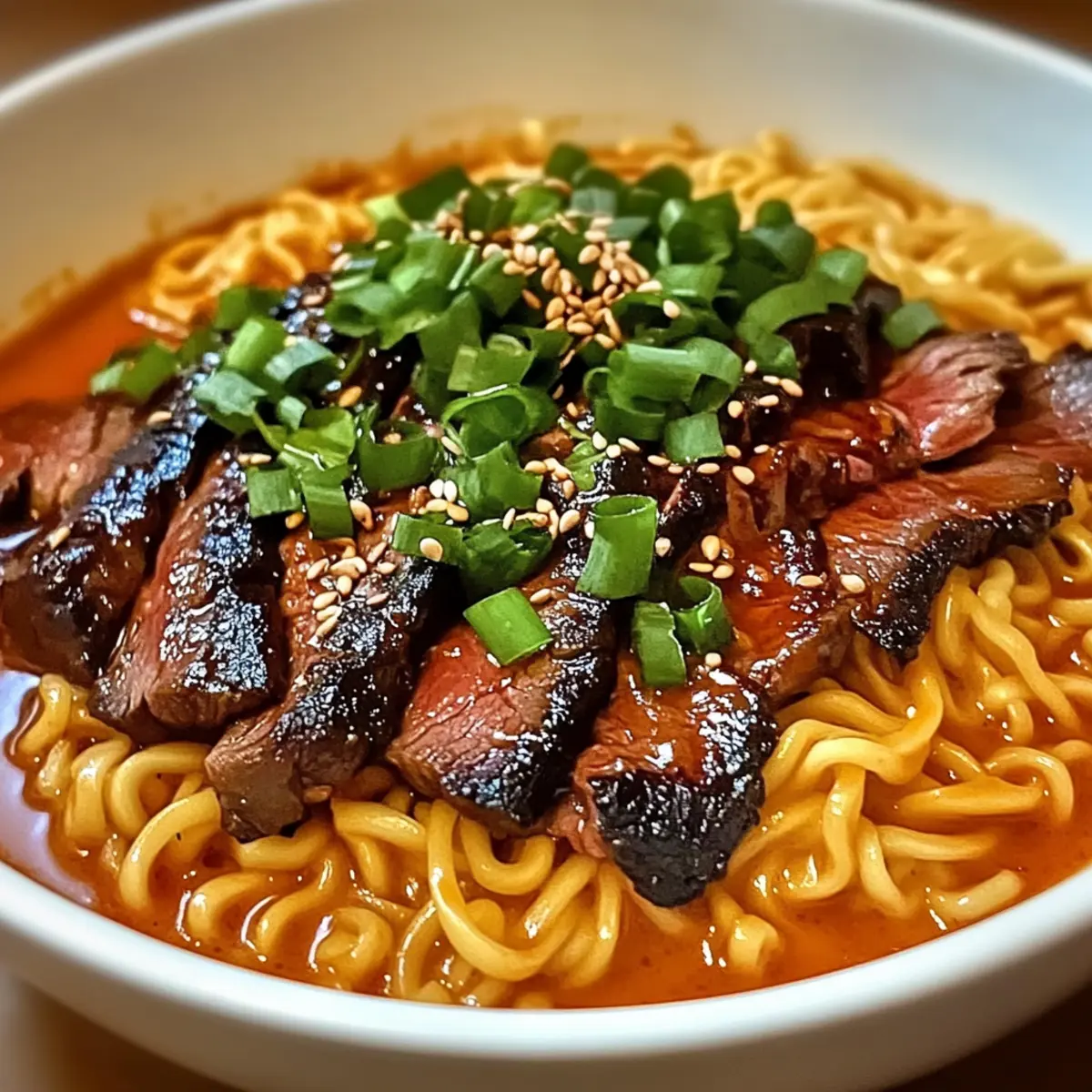 Scharfe Koreanische Nudeln mit gegrilltem Rindfleisch