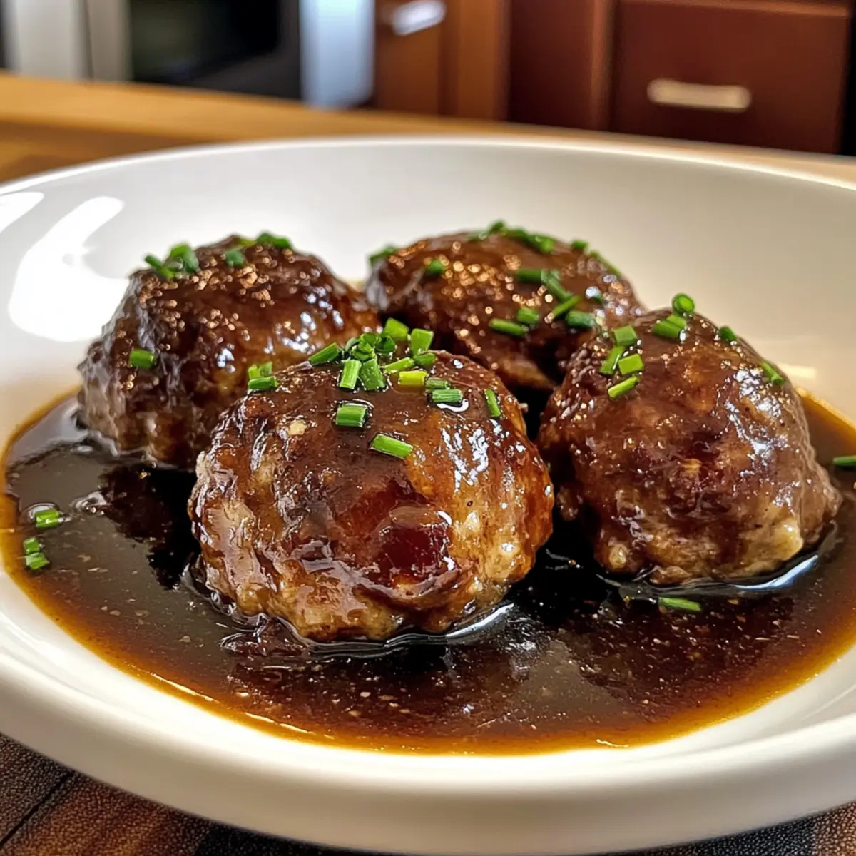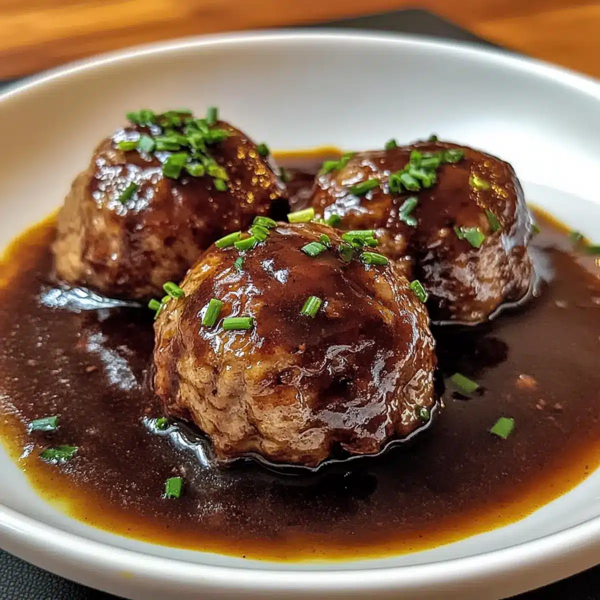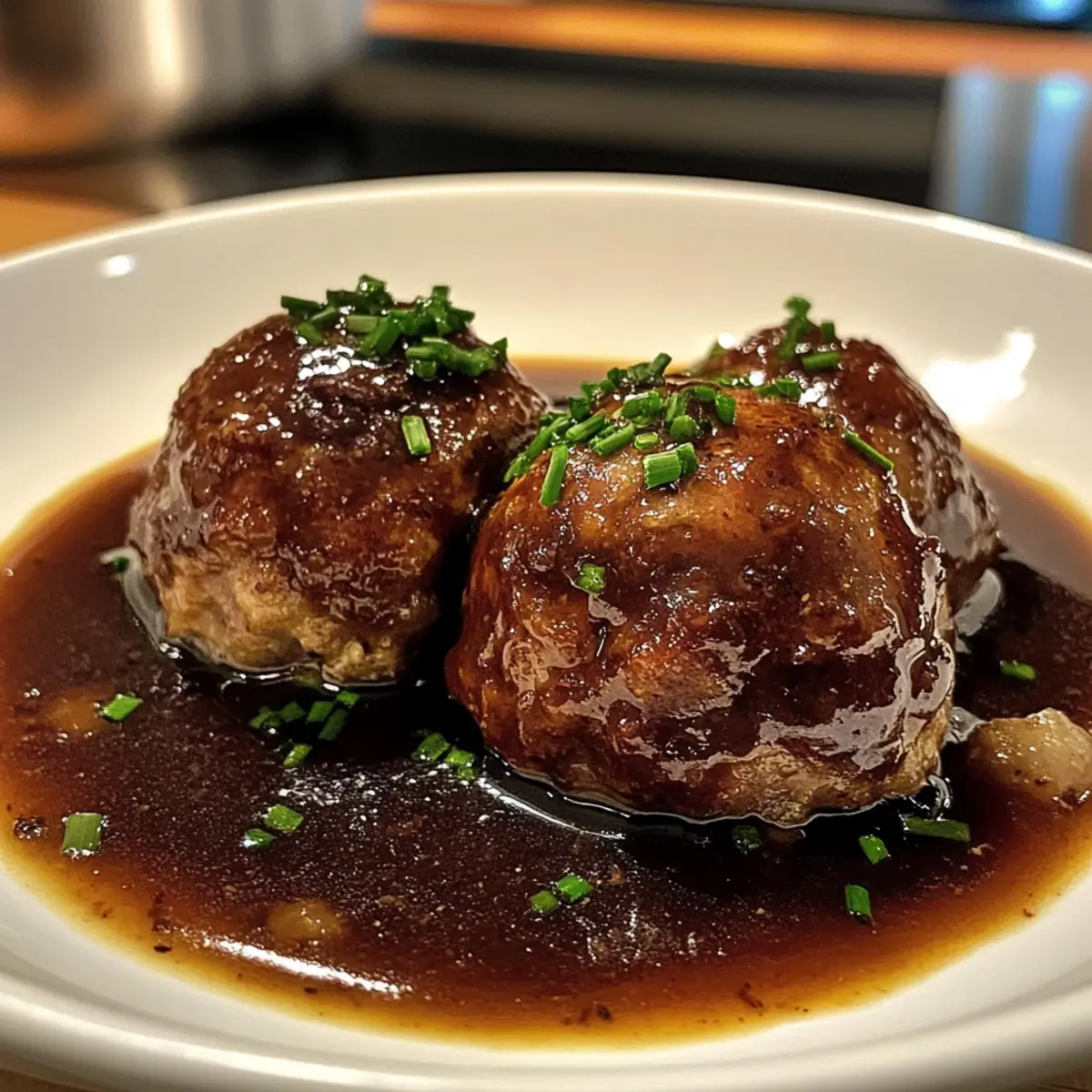 Hebe die Frikadellen vorsichtig aus der Soße und serviere sie heiß. Verfeinere das Gericht nach Belieben mit frisch gehackten Schnittlauchröllchen. Die Deftigen Frikadellen in dunkler Soße sind nun bereit, deinen Tisch zu zieren und werden deine Familie begeistern!