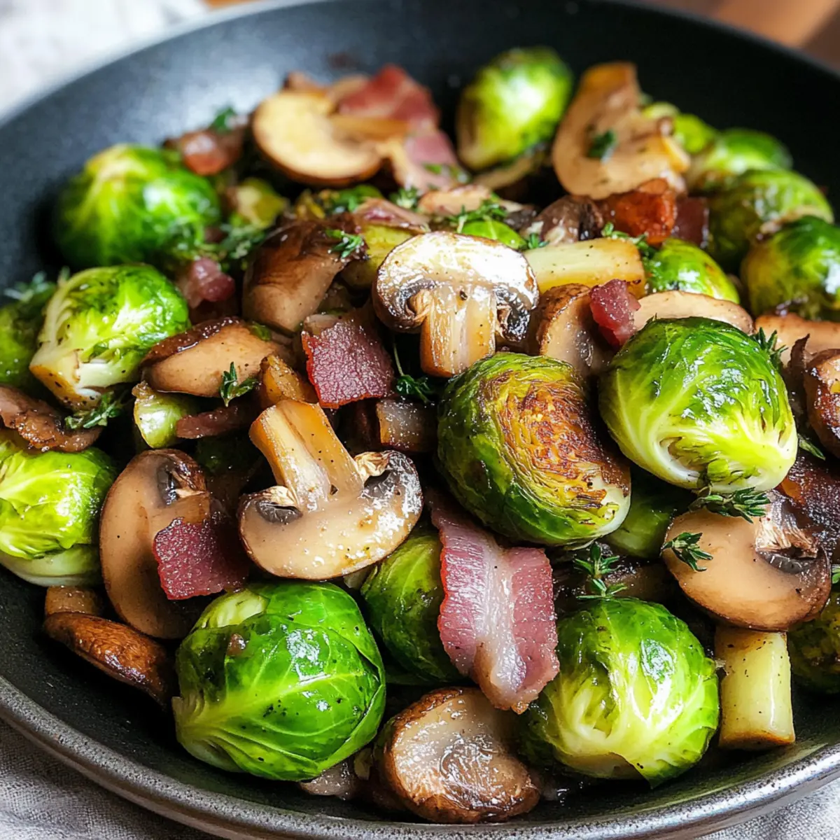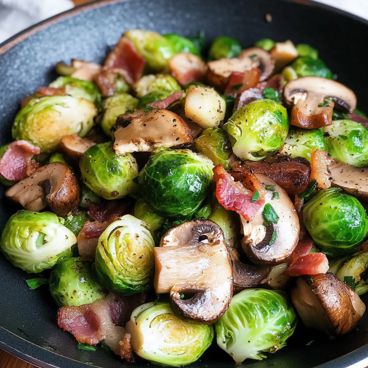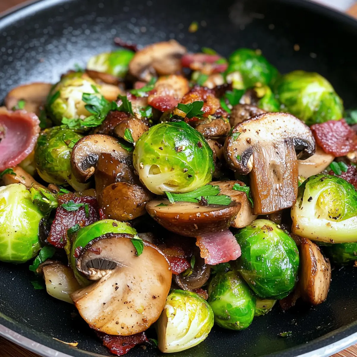Schmackhaftigkeit: Der Kombination aus gehärtetem Rosenkohl, herzhaften Pilzen und gewürfeltem Speck verdankt die Pfanne ihren unwiderstehlichen Geschmack – perfekt, um auch skeptische Esser zu überzeugen!