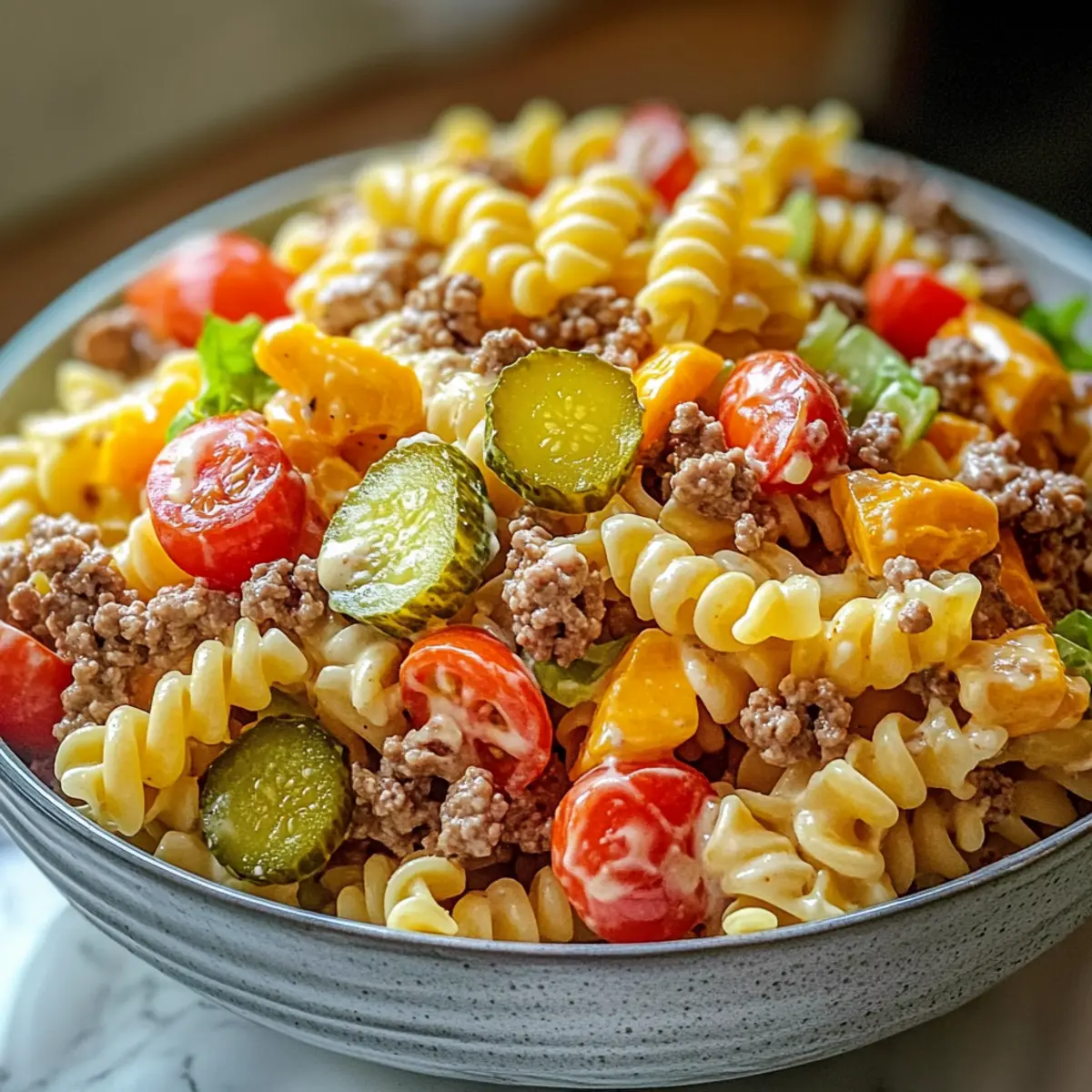 Hinweis: Diese Zutaten sind perfekt, um deinen Big Mac Pasta Salat zu kreieren, der die Aromen eines klassischen Fast Foods in eine frische, kreative Version verwandelt.