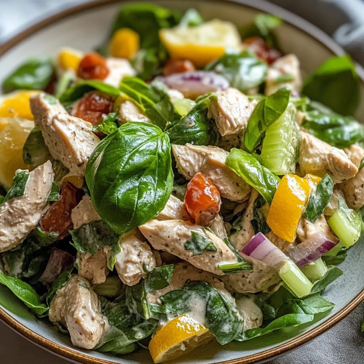 Richtiges Dressing: Achte darauf, das Dressing gut zu vermengen, damit jeder Bissen des Einfache Zitronen-Basilikum-Hühnchensalats gleichmäßig cremig schmeckt.