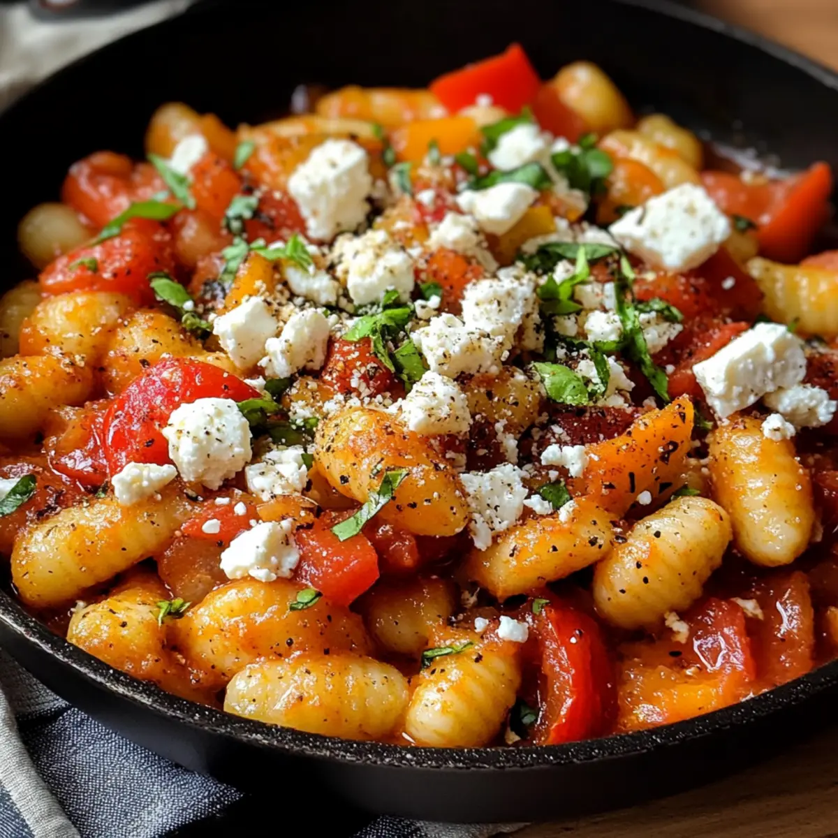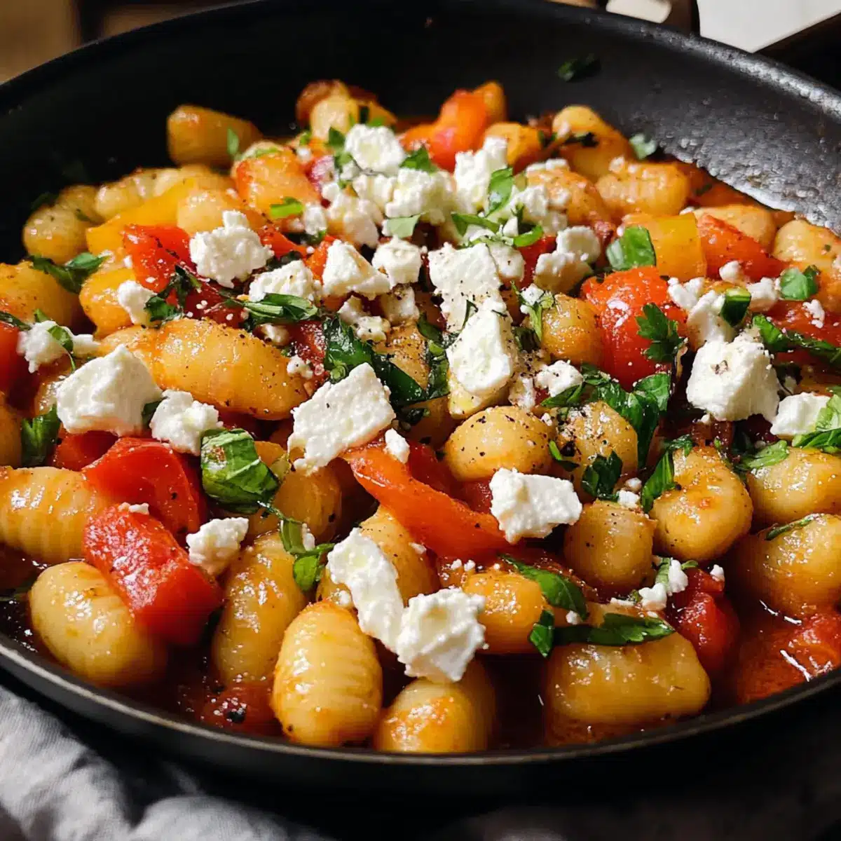 Schmecken Sie die Mischung mit Salz und Pfeffer ab, um den Geschmack zu intensivieren. Bröckeln Sie den Feta über die Gnocchi und rühren Sie leicht um, um ihn in die Sauce zu integrieren. Garnieren Sie mit frischer Petersilie, bevor Sie servieren und genießen Sie dieses köstliche, bunte Gericht!
