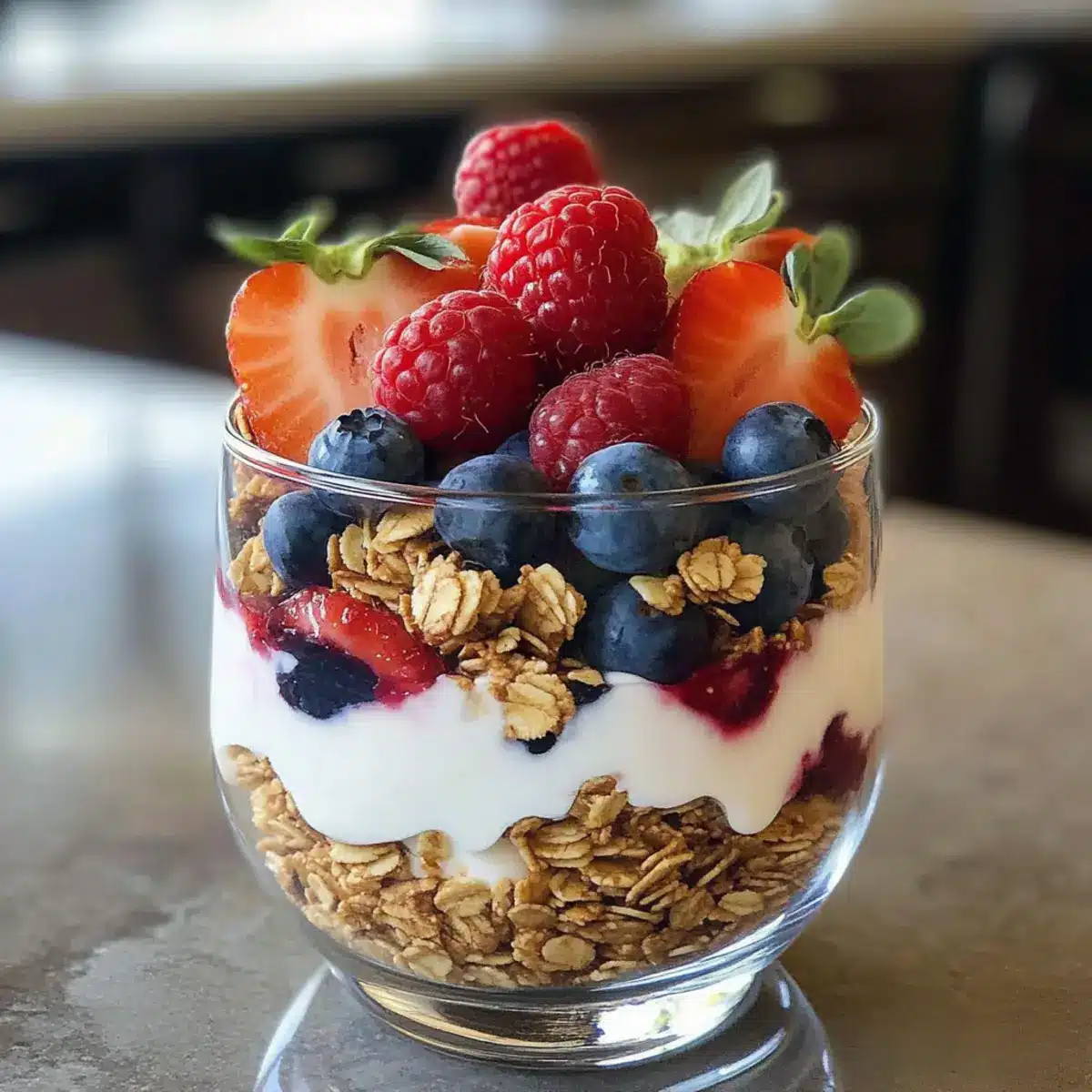 Jetzt kommt der Crunch: Streue eine Schicht Granola über die Beeren. Verwende etwa ein Viertel bis ein Drittel einer Tasse, damit du die perfekte Textur erhältst. Der knusprige Geschmack des Granolas harmoniert wunderbar mit den saftigen Beeren und dem cremigen Joghurt. Durch diese Schichtung kannst du das Griechischer Joghurt Beeren Parfait weiter verbessern.