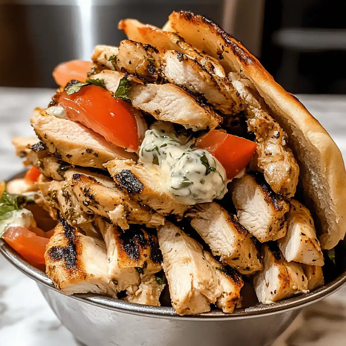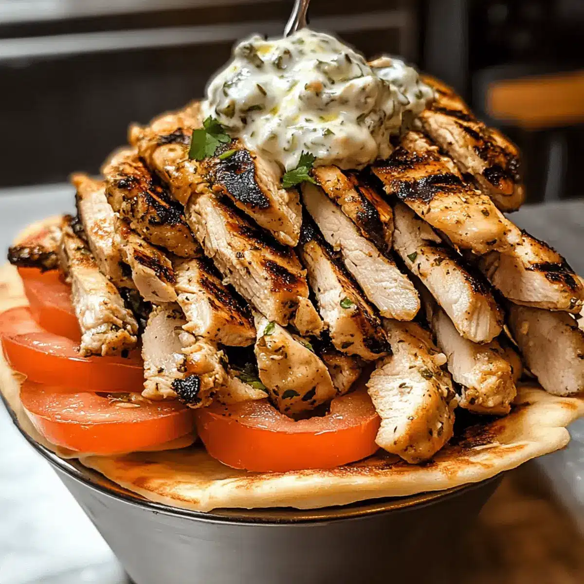 Das ruhende Hähnchen in dünne Scheiben schneiden und auf das vorbereitete Pita-Brot legen. Großzügig mit dem cremigen Tzatziki garnieren und frische Tomaten, Zwiebeln und Salatblätter hinzufügen. Die Kombination der Aromen und Texturen bringt das griechische Erlebnis direkt auf deinen Teller.