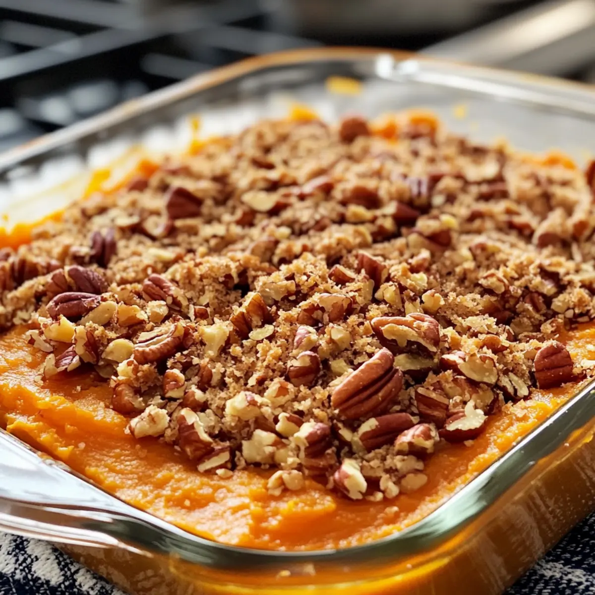 Dieser köstliche Ina Gartens Süßkartoffelauflauf mit Pekannüssen Rezept ist perfekt für die Vorbereitung im Voraus! Du kannst die Süßkartoffeln bis zu 24 Stunden vor dem Backen kochen und pürieren, um wertvolle Zeit zu sparen. Püriere die Süßkartoffeln und bewahre sie in einem luftdichten Behälter im Kühlschrank auf, damit sie frisch bleiben. Auch das Topping mit Pekannüssen und Haferflocken kannst du bis zu 3 Tage im Voraus zubereiten und im Kühlschrank aufbewahren, um die Knusprigkeit zu bewahren. Wenn es Zeit zum Backen ist, gieß die Süßkartoffelmasse in deine Auflaufform, streu das Topping gleichmäßig darüber und backe für 30-35 Minuten bei 180°C, bis es goldbraun ist. So gelingt dir ein schmackhaftes Gericht mit minimalem Aufwand, das trotzdem frisch und lecker bleibt!
