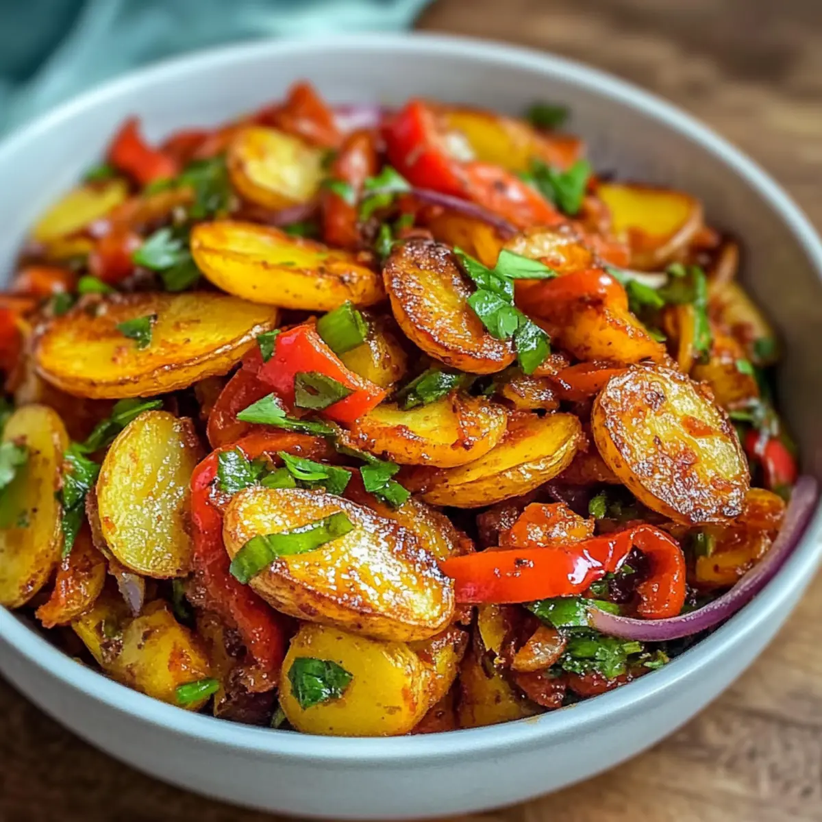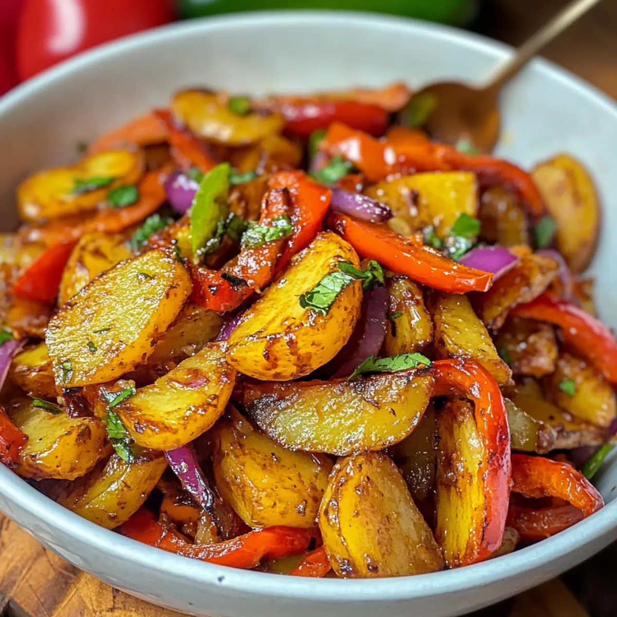 Vibrante Farben: Die Mischung aus goldbraun gerösteten Kartoffeln, bunten Paprika und zarten Zwiebeln verleiht jedem Teller einen ansprechenden Look.
