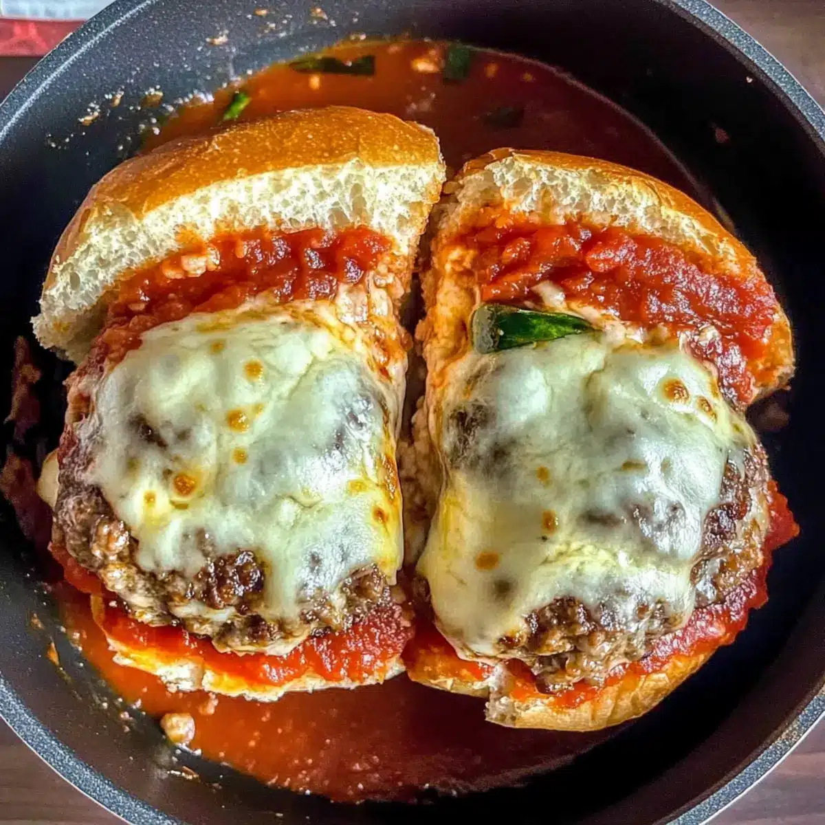 - Patties wenden, Marinara-Sauce darüber gießen und eine Scheibe Mozzarella darauf legen.