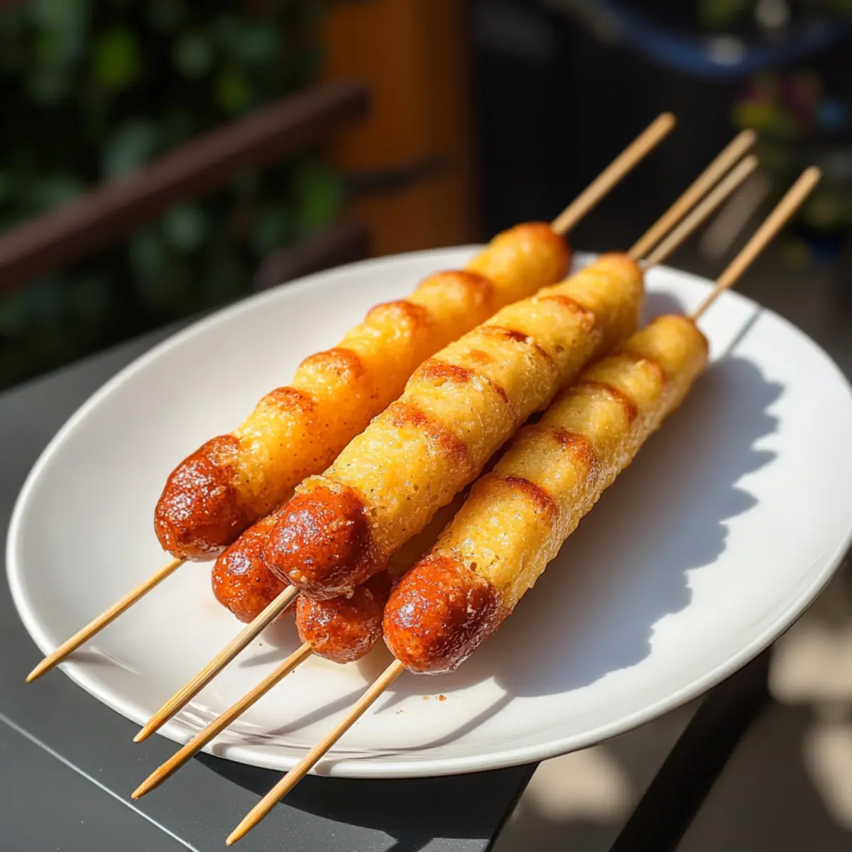 Stecke die Würstchen auf Holz-Spieße, sodass sie sicher gehalten werden können. Achte darauf, dass du genügend Platz lässt, um sie gut zu tauchen. Wenn du kleinere Würstchen verwendest, kannst du diese kreativ variieren. Diese Vorbereitung dauert nur 2-3 Minuten. Die Würstchen sind bereit, nach dem Eintauchen in den Teig frittieren zu werden.
