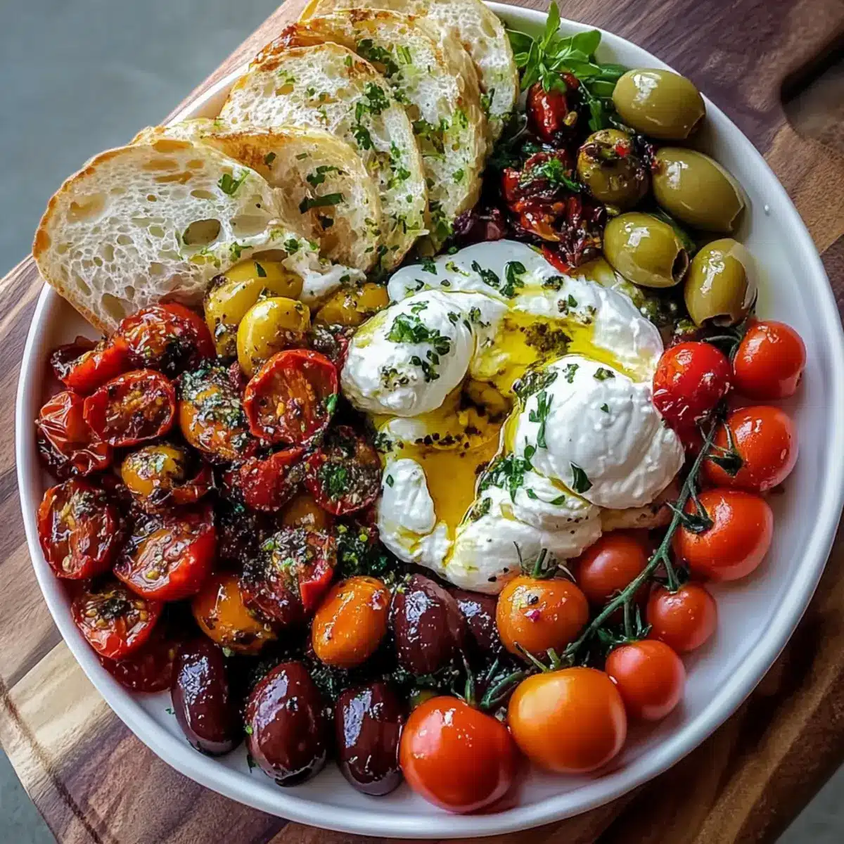 Knoblauchbrot: Servieren Sie warmes, knuspriges Knoblauchbrot, um die cremige Burrata und die Aromen der Oliven und Tomaten ideal zu ergänzen. Der Knoblauchgeschmack harmoniert wunderbar mit den frischen Zutaten.