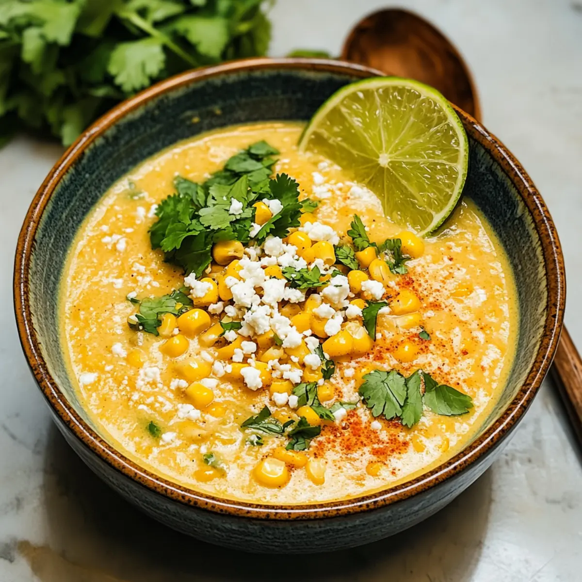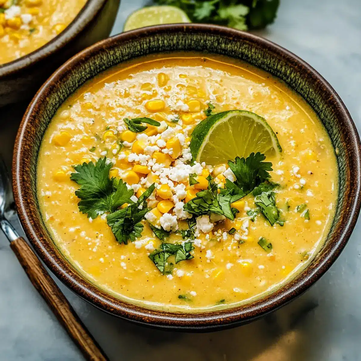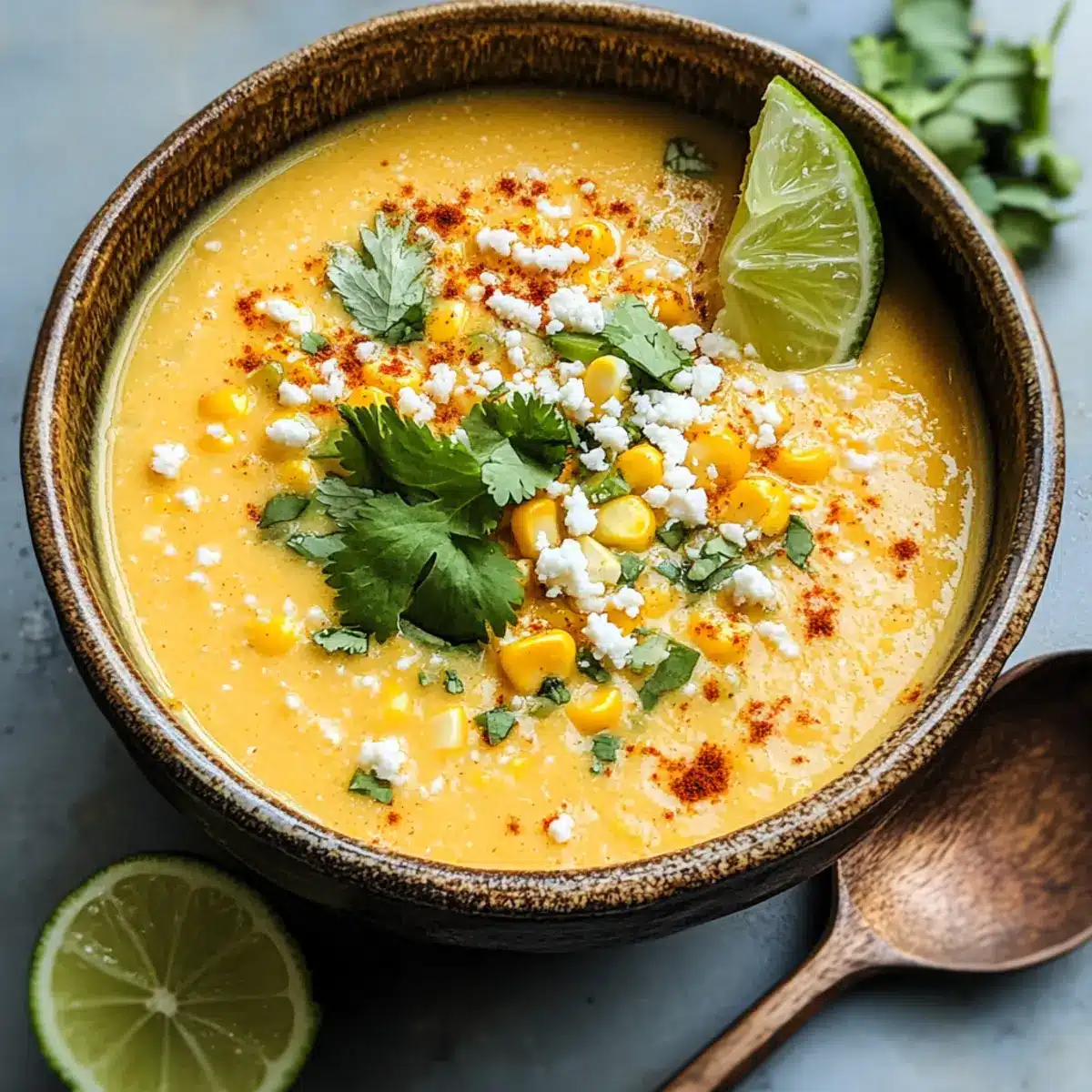 Löffle die köstliche Mexikanische Straßenmais-Suppe in Schalen und richte sie nach Belieben mit zusätzlichen Cotija-Käse, Limettenvierteln und frischem Koriander an. Diese Suppe ist nun bereit, serviert zu werden und bringt die Geschmäcker Mexikos direkt zu dir nach Hause.