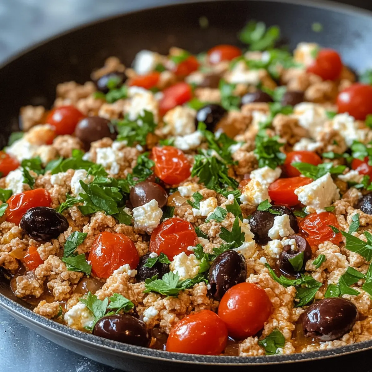 Mittelmeer Keto Hackfleisch-Pfanne mit Oliven und Feta