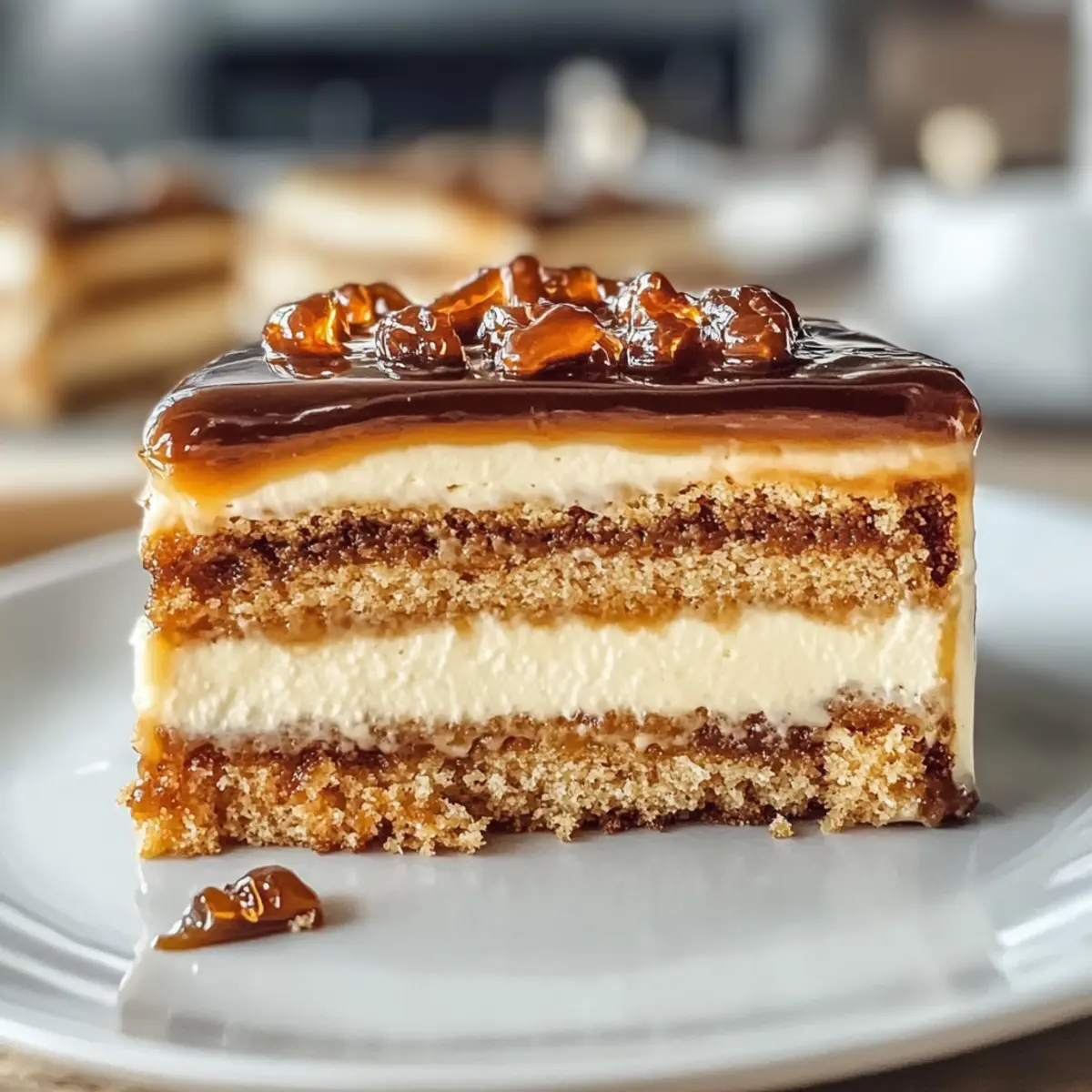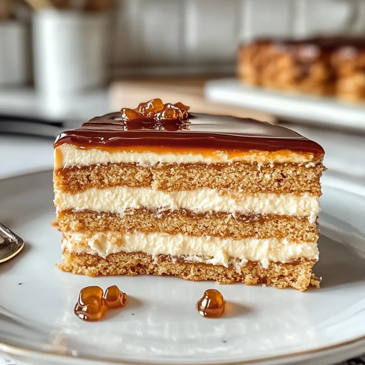 Gieße eine gleichmäßige Schicht des Milchmädchen-Karamells oder das selbstgemachte Karamell über die Cremeschicht. Verwende einen Spatel, um das Karamell sanft zu verteilen und darauf zu achten, dass es gleichmäßig deckt. Dies verleiht dem Kuchen eine süße und feuchte Note, die jedem Bissen Geschmack verleiht.