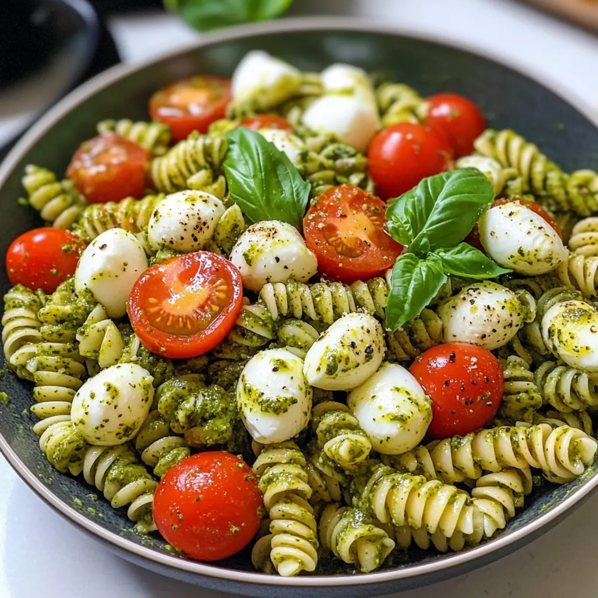 Pesto-Nudelsalat mit Tomaten und Mozzarella genießen