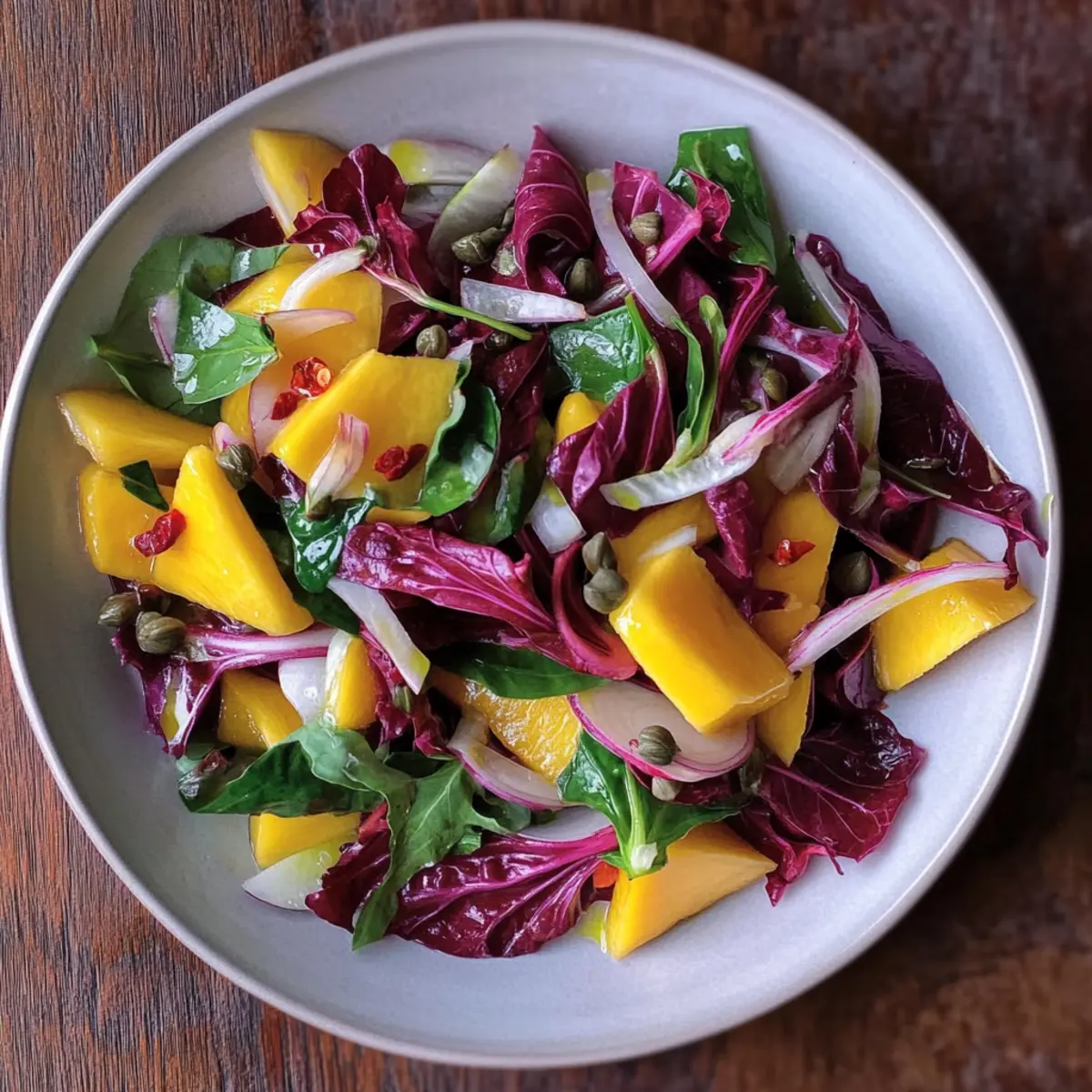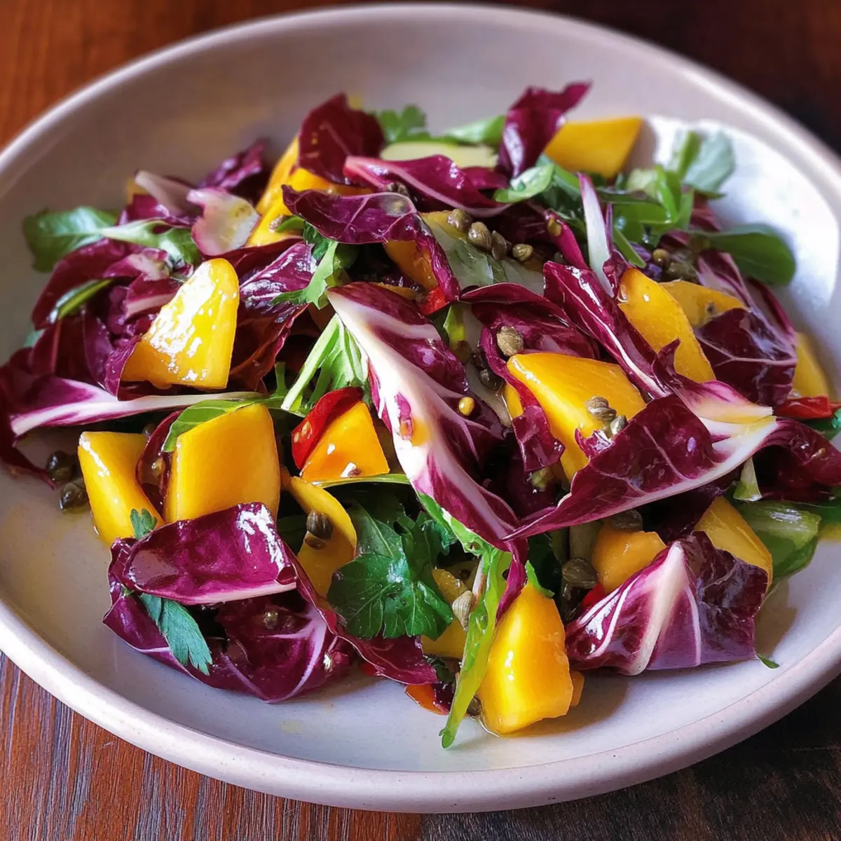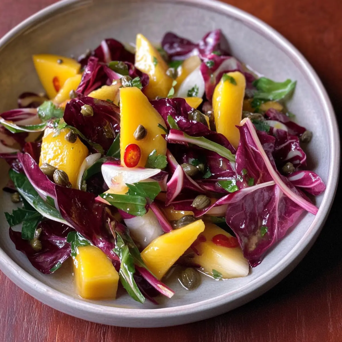 - Sofort servieren: Radicchio-Salat mit Mango frisch genießen.