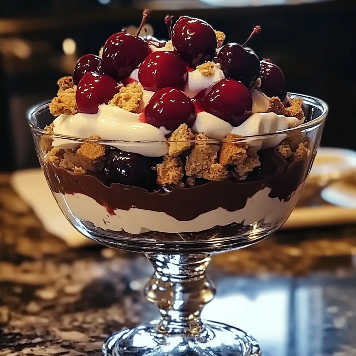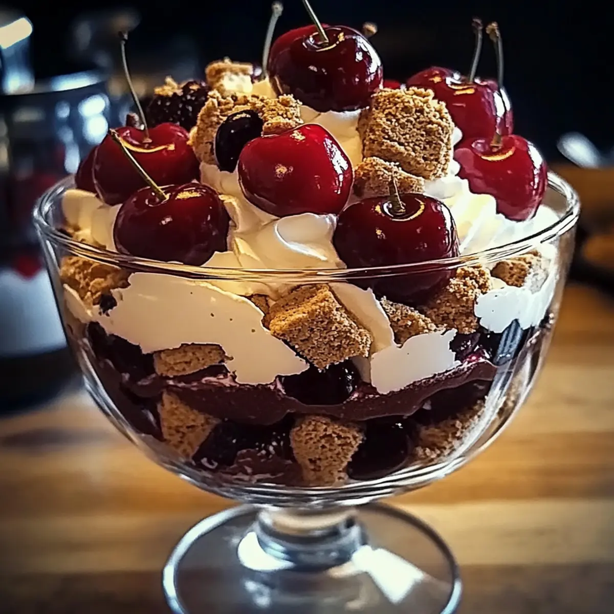 - Schichte den Schokoladenkuchen, die Sahne und die Kirschen in einer Trifle-Schüssel.