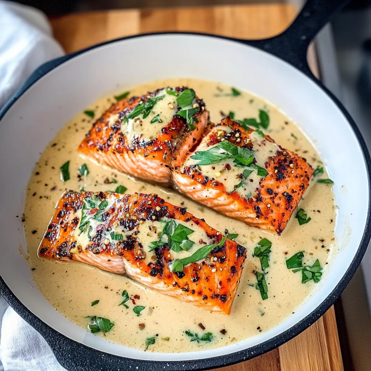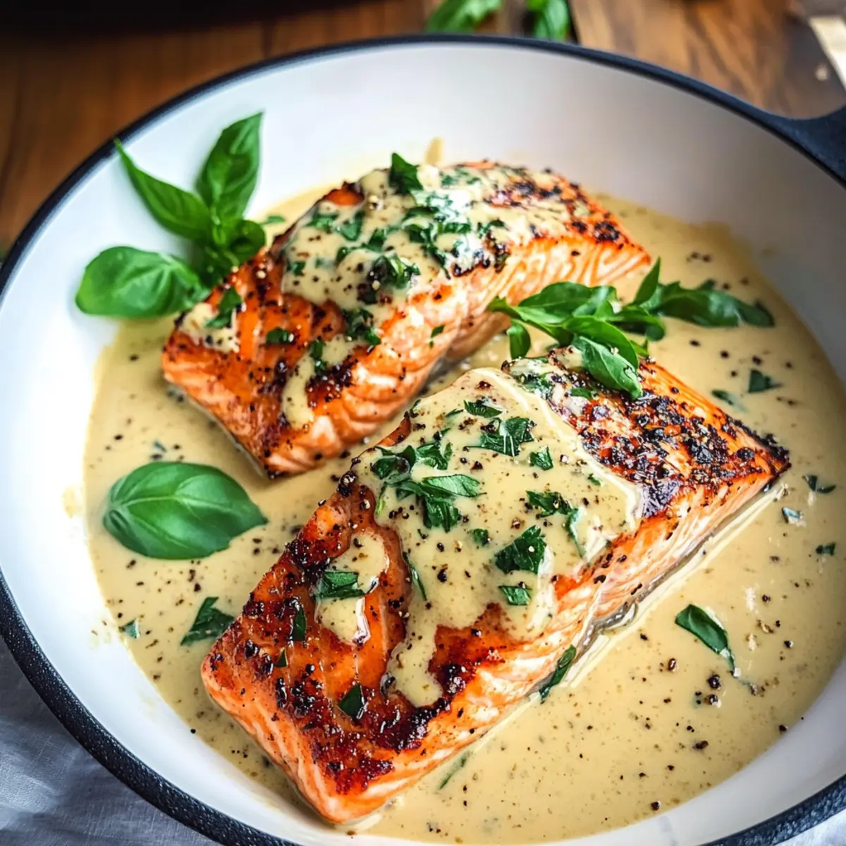 Legen Sie die angebratenen Lachsfilets zurück in die Pfanne und lassen Sie sie weitere 2 Minuten sanft in der Sauce ziehen. Dies ermöglicht es dem Marry Me Lachs, die köstlichen Aromen der Sauce aufzusaugen, sodass jedes Bissen zu einem Genuss wird. Servieren Sie das Gericht heiß, und genießen Sie es in vollen Zügen!