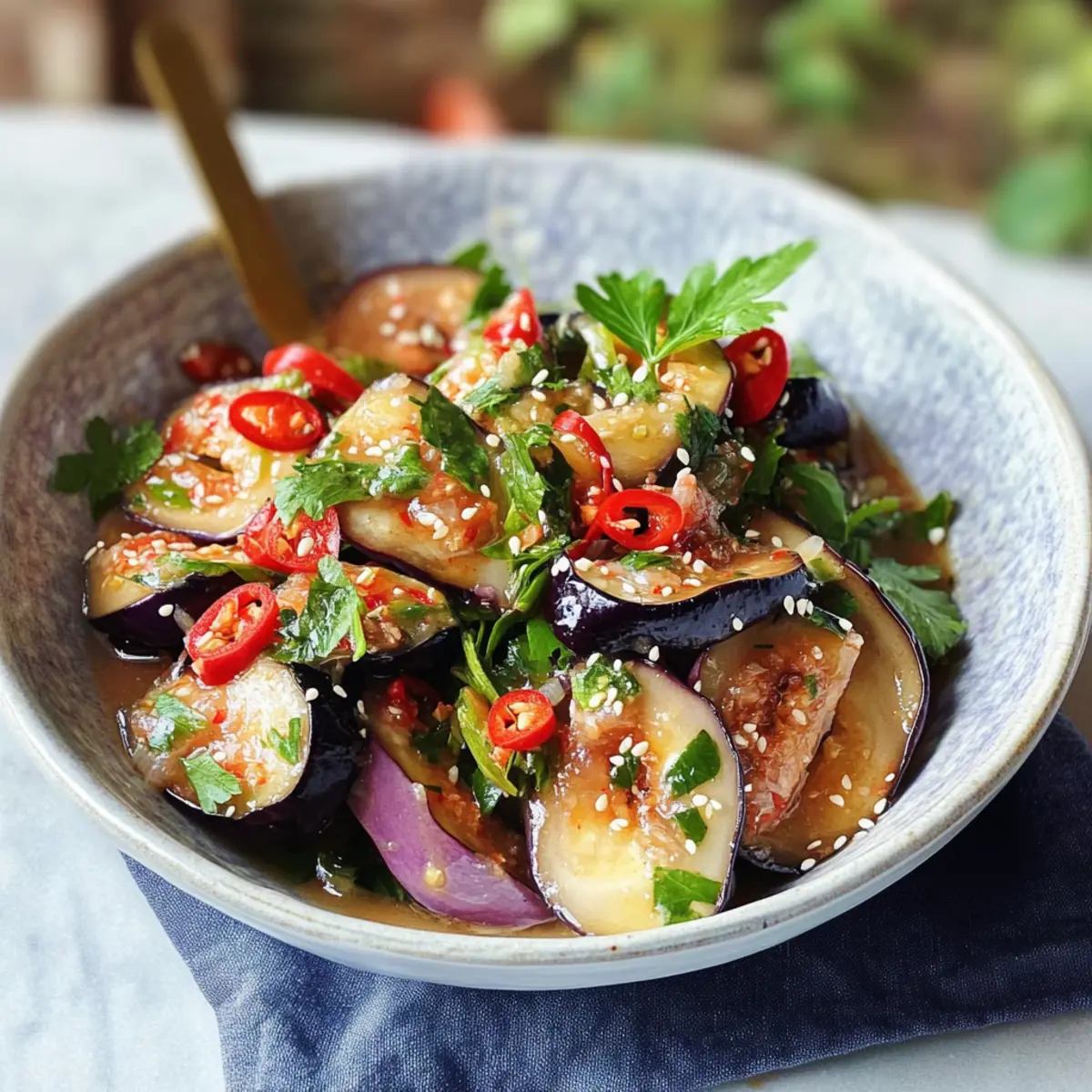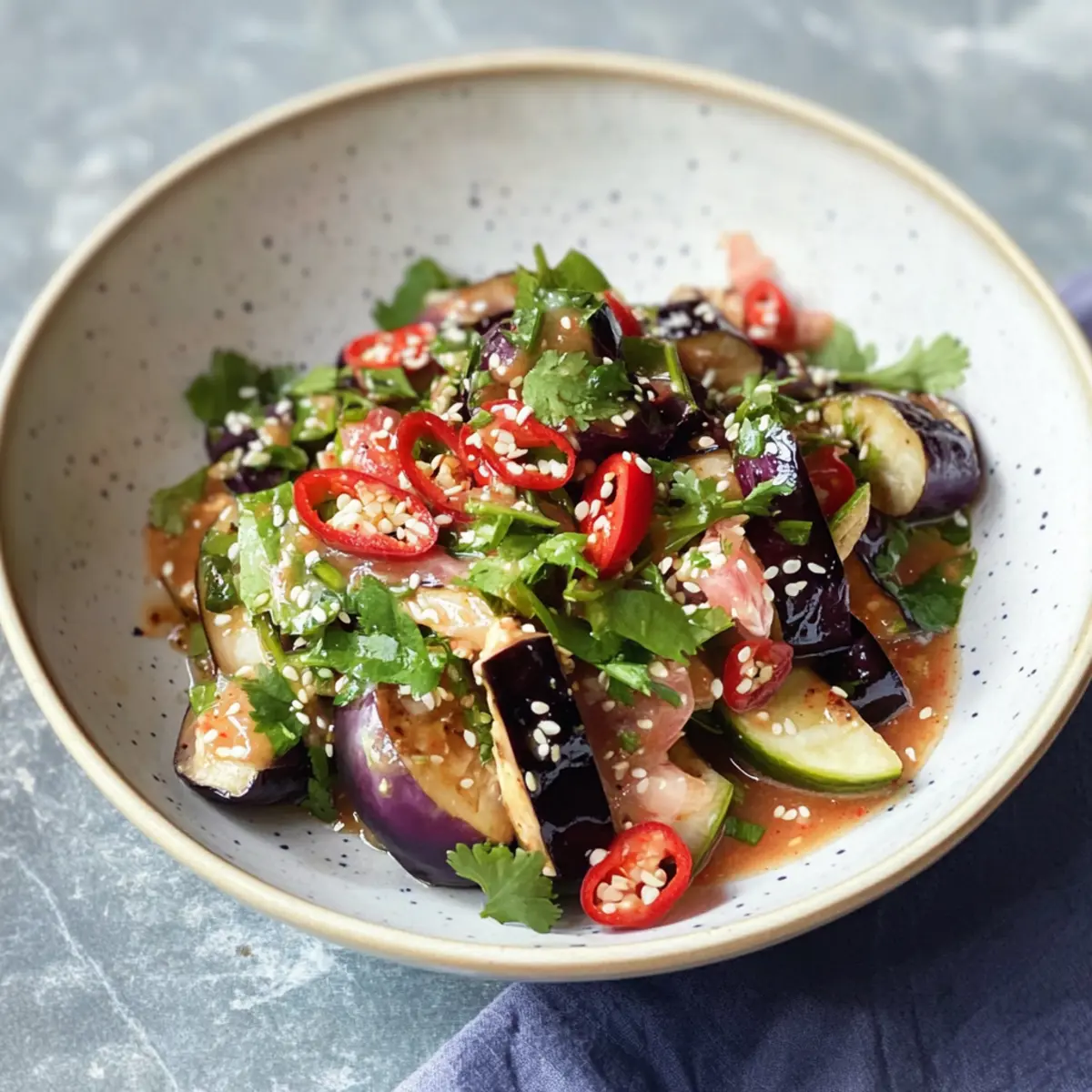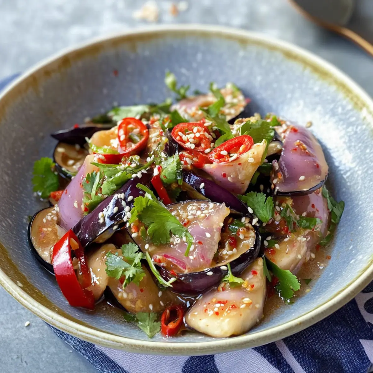Frische Aromen: Der Thai-Auberginensalat kombiniert knackiges Gemüse mit dem nussigen Geschmack von Sesam, was jede Gabel zu einem Erlebnis macht. Einfache Zubereitung: In nur 25 Minuten ist dieser Salat bereit, was ihn zur idealen Wahl für vielbeschäftigte Tage macht. Glutenfrei und gesund: Genießen Sie eine köstliche Mahlzeit, ohne sich um Gluten sorgen zu müssen. Vielseitige Variationen: Passen Sie das Rezept an, indem Sie etwa gerillte Shrimps hinzufügen oder die Auberginen gegen Zucchini austauschen. Perfekte Beilage: Ob zum Grillabend oder als leichtes Mittagessen, dieser Salat macht immer Eindruck. Erfahren Sie auch mehr über unseren Mediterraner Olivenöl Dip für eine köstliche Ergänzung!